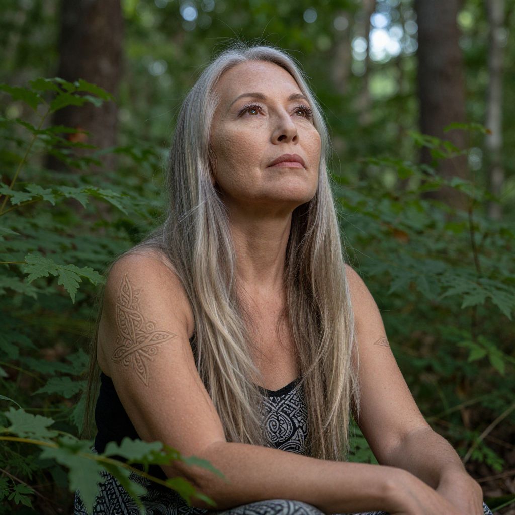 Photograph of a middle-aged woman with long, straight, silver-gray hair, sitting in a forest. She has light skin and a tattoo of intricate, swirling patterns on her right upper arm. She is wearing a black, sleeveless top with a subtle pattern. Her expression is serene, with her gaze slightly upward. The background is densely wooded with green foliage and tall trees, creating a natural, peaceful setting. The lighting is soft, highlighting her hair and facial features. The image has a natural, candid feel.