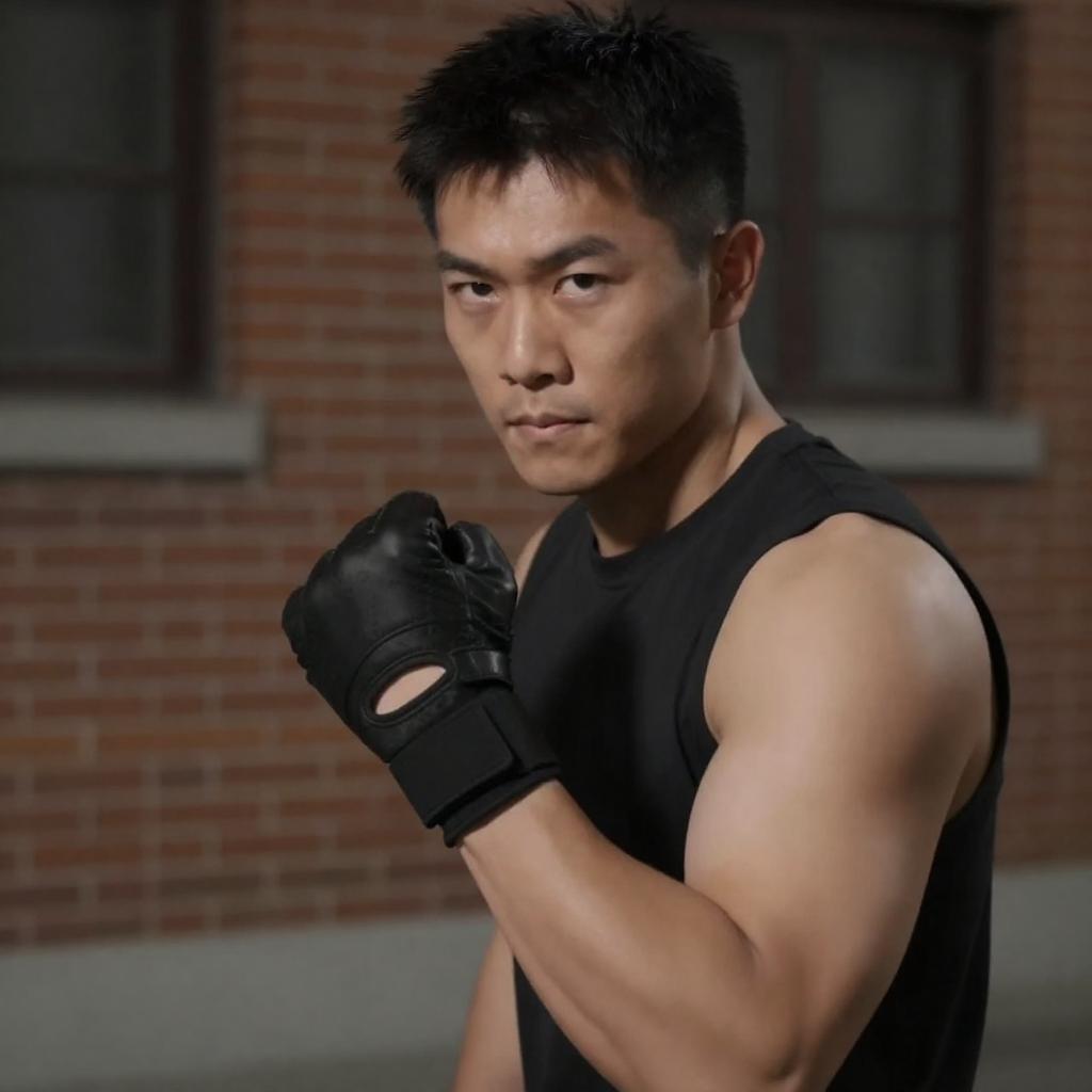 Photograph of a muscular Asian man with short black hair, wearing a black sleeveless shirt and black fingerless glove, raising his right fist. Brick wall and window in the background. His expression is focused and determined. Nighttime setting.