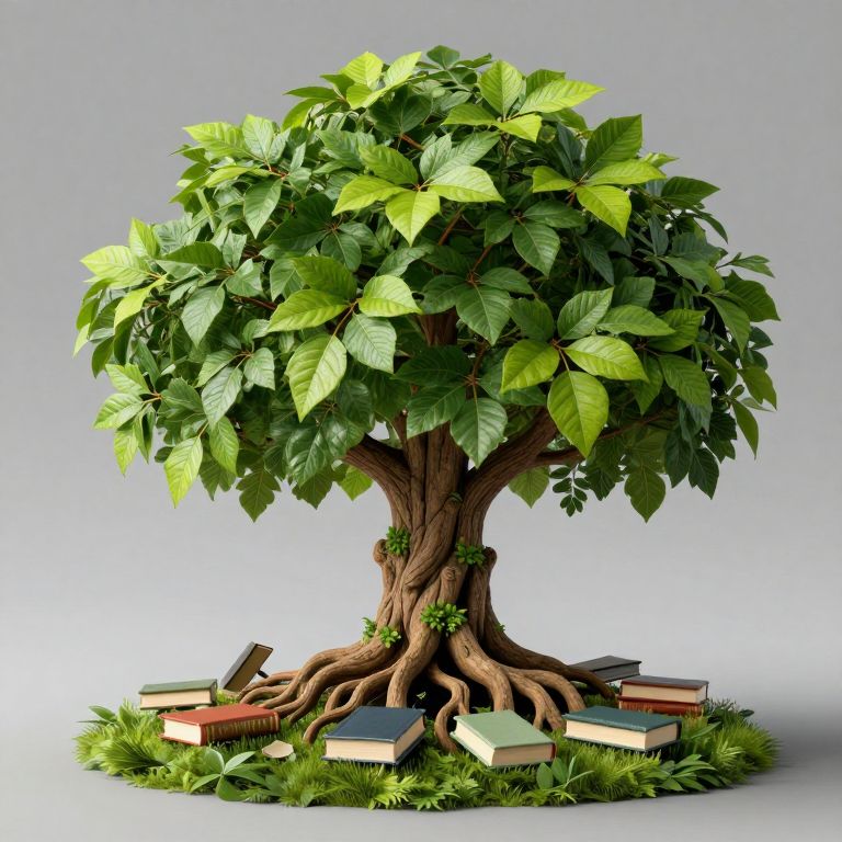 A surreal \"book tree\" emerges from a lush green base, its branches adorned with vibrant leaves while its roots cradle a collection of books, seamlessly blending nature and knowledge in an imaginative display.