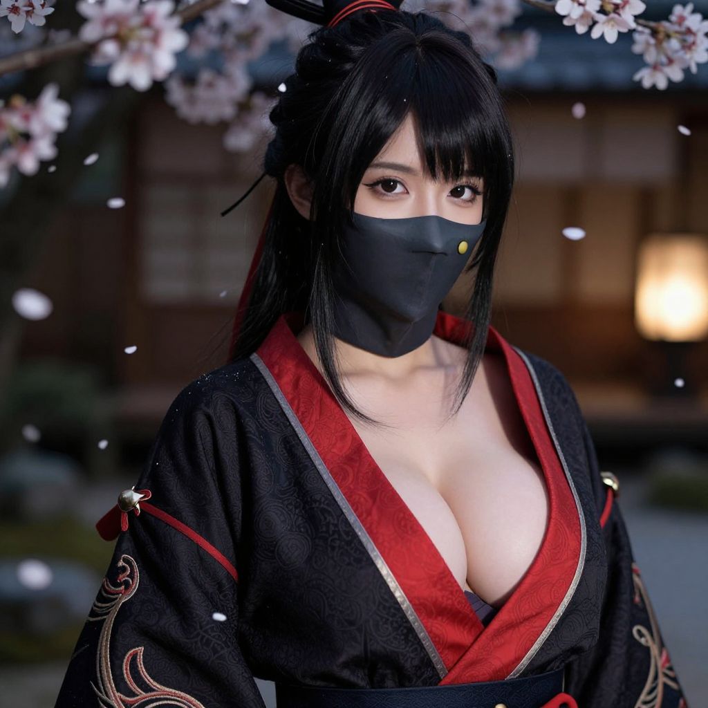 Digital artwork of an Asian woman with black hair, large breasts, wearing a black kimono with red trim and black face mask, standing under cherry bloss