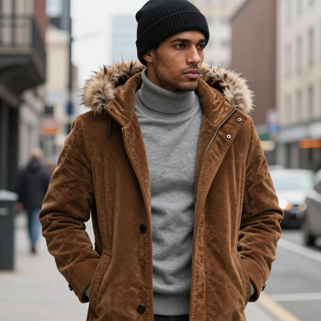 Male winter clothes dress, photorealistic, male model, standing outdoors, urban background, daytime, winter clothing, brown corduroy coat with fur-lined hood, grey turtleneck, black knitted beanie, handsome, light brown skin, strong jawline, serious expression, hands in pockets, city buildings blurred in background, natural light, realistic ures, sharp details, medium shot, upper body focus