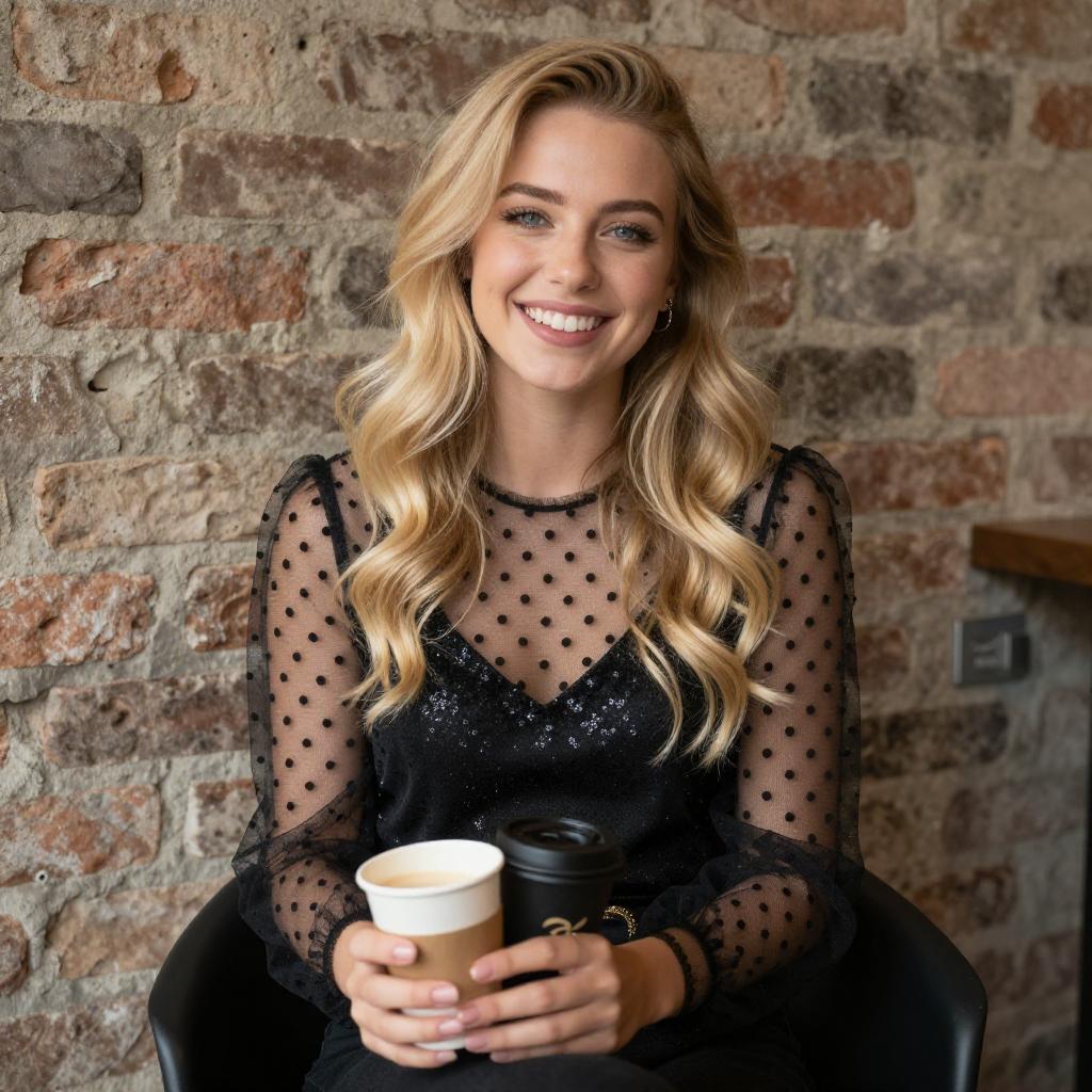 Photograph of a blonde woman with long, wavy hair, wearing a sparkly gray dress and black boots with red heart accents. She is squatting, holding a white mug with red , smiling with her eyes closed. Background includes dark, industrial setting with metal beams and string lights.