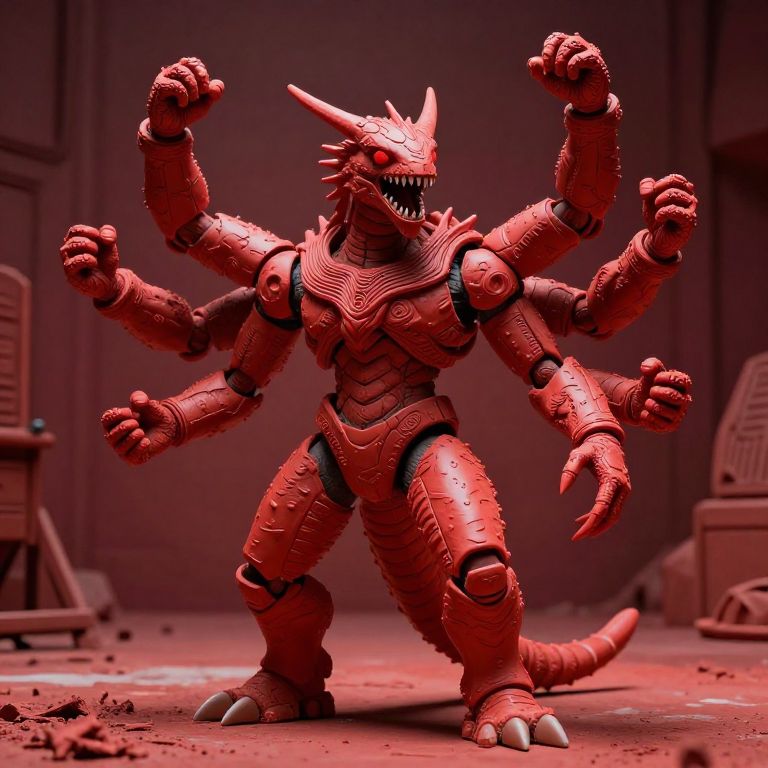 Digitally rendered, red, six-armed robotic monster with spiked armor, horns, and sharp teeth, standing in a dimly lit, red-h