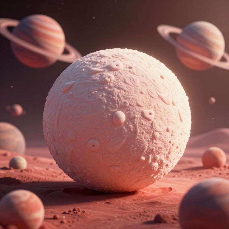 Giant, textured spheres resembling marshmallows dominate a surreal cosmic landscape, rolling slowly across a reddish terrain while surrounded by smaller planets and rings, all bathed in a warm, ethereal glow that casts soft shadows and creates a dreamlike atmosphere.