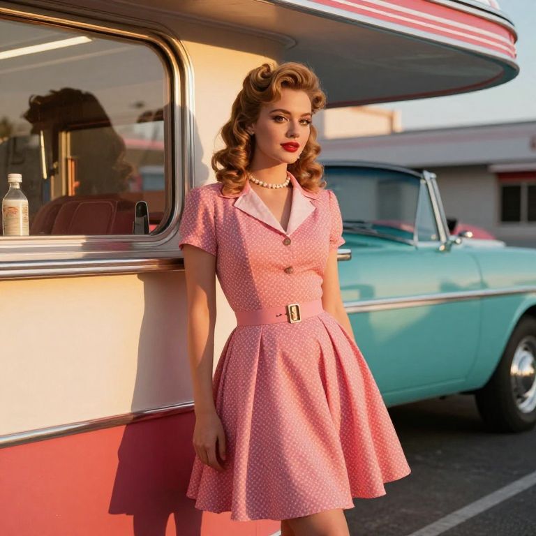 Buxom blondes styled as classic movie stars in a retro 1950s diner, neon signs glowing, bold makeup, satin dresses, nostalgic vibrant scene