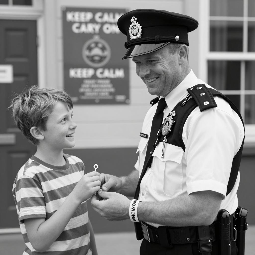 Black-and-white photograph of a man and a young boy. Man wears a police uniform, cap with badge, and striped shirt, smiling, holding a "Keep Calm and Carry On" wristband. Boy, also in striped shirt, holds a small object, smiling at the man. Background includes blurred wall posters and door. Man stands slightly to the right, boy to the left.