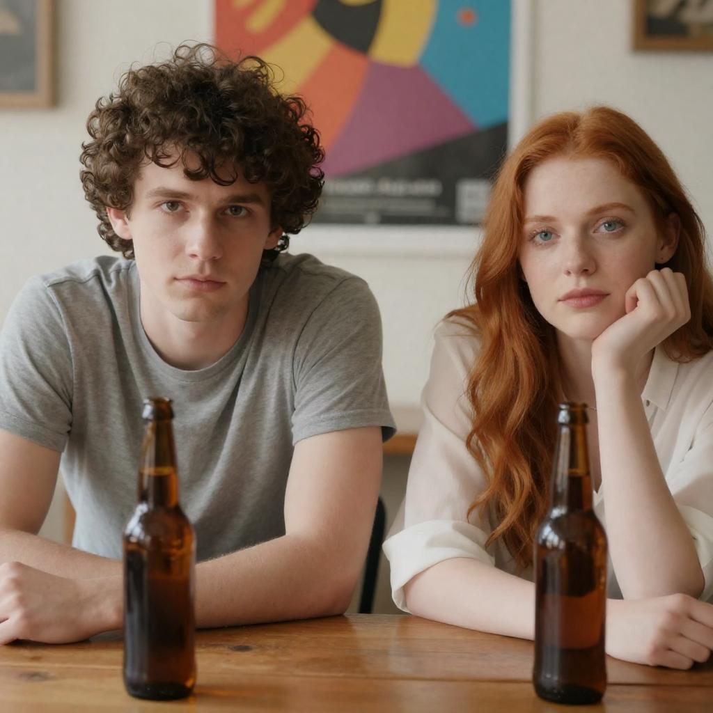 A young man and woman sitting on a wooden park bench. The man, with curly brown hair and glasses, is dressed in a black t-shirt and beige pants, sitting with legs crossed and looking to the left. The woman, blonde with wavy hair, wearing a black dress and black high heels, holds a can while looking forward. A red fire extinguisher is placed on the ground next to the bench. The background features green grass and trees in an outdoor park setting.