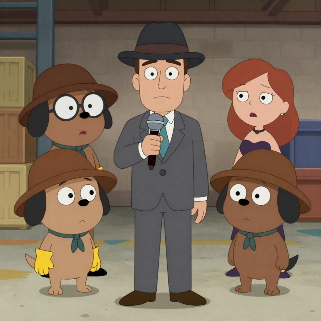 Animated scene: man in gray suit, black hat, and tie stands in warehouse, holding microphone, surrounded by cartoon characters. Three dogs in brown hats, one with yellow gloves, another white with glasses, and a red-haired woman in strapless dress. Background: crates, boxes, brick wall, industrial setting. Man's expression: neutral, serious. Cartoon characters: surprised, annoyed.