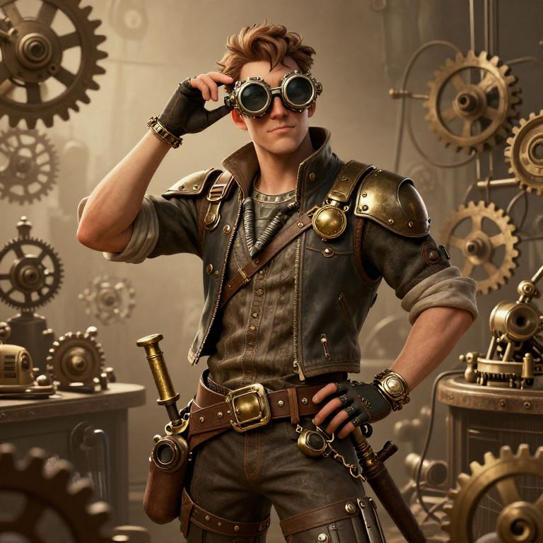 Random animated character generator depicting a steampunk inventor, intricate mechanical accessories, vintage workshop background, goggles and toolbelt, energetic expression, textured oil painting style, rich earthy tones, imaginative and detailed design