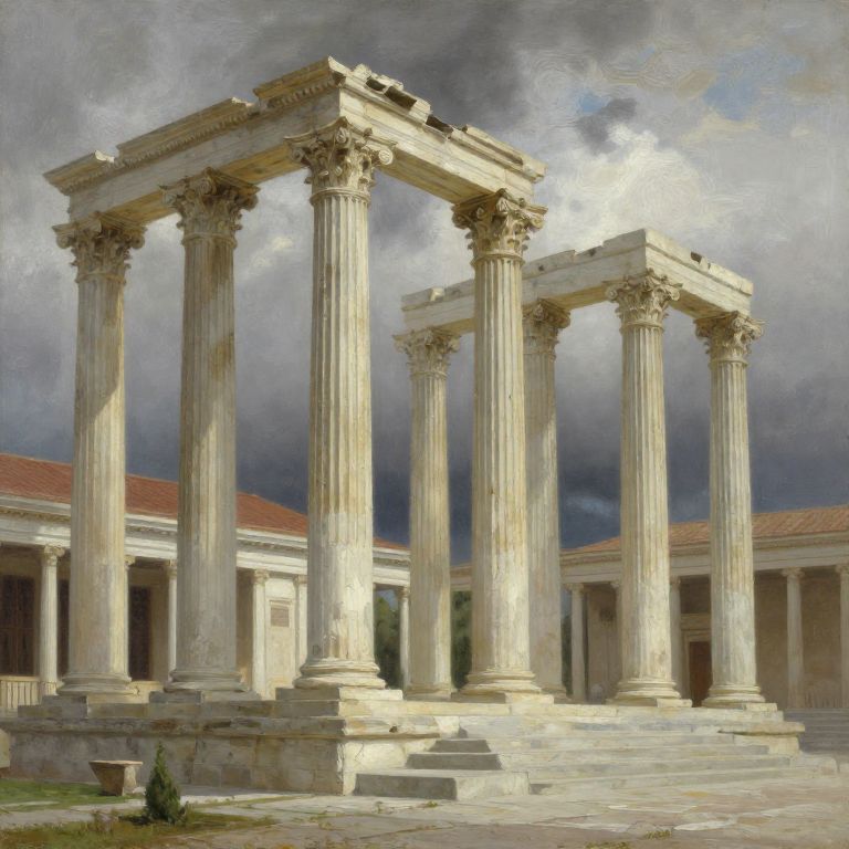 Un conjunto de columnas clásicas griegas con capiteles jónicos, elevándose en una plaza histórica bajo un cielo dramático nublado, renderizado en estilo pintura al óleo con texturas ricas.