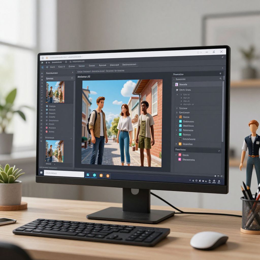 Photograph of a modern desktop setup featuring a black, slim-profile monitor displaying a photo editing software interface. The screen shows two people standing outdoors on a sunny day, one in a brown jacket and jeans, the other in a white shirt and green shorts, with a brick building in the background. The software interface includes various editing tools and layers on the right. The desk is light wood with a black keyboard, white mouse, and small potted plant on the left. A figurine of a man in a suit is on the right. Bright, blurry background suggests an office with large windows.