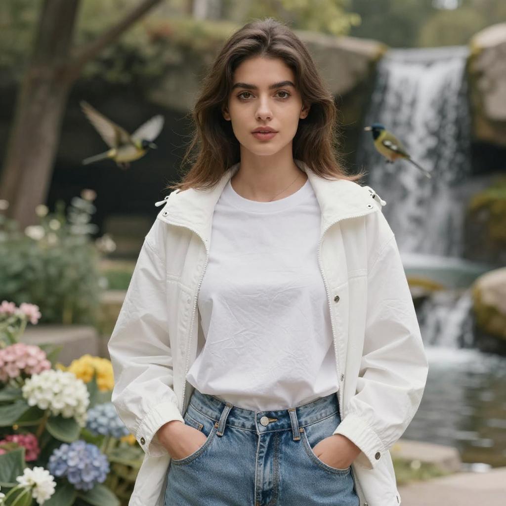 1girl, brown hair, beautiful brown eyes, small breast, best quality, hires, diffused natural sunlight, park, woods, flowers, birds, waterfall, detailed photorealistic background, white jacket, jeans, fashion girl, wrinkle t-shirt, hair covers ears, hands in pocket, kkw-ph1