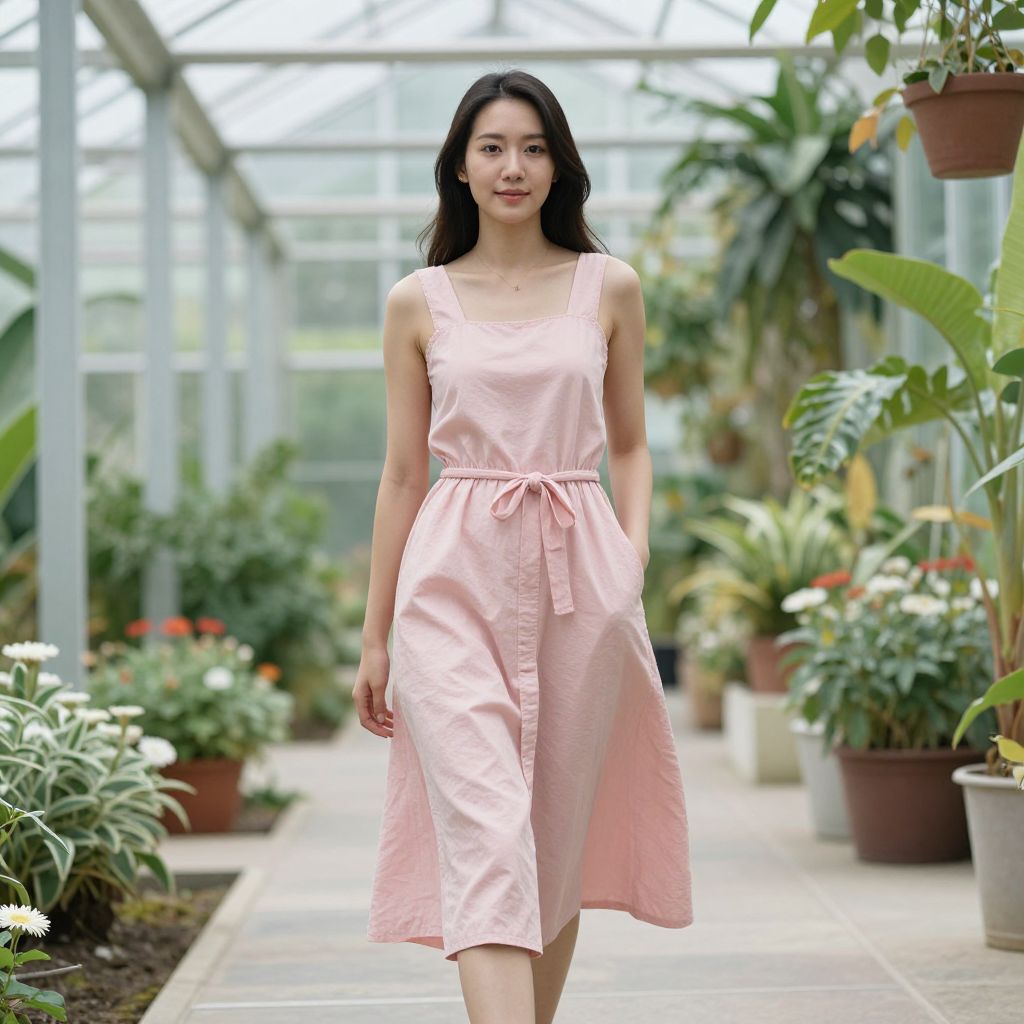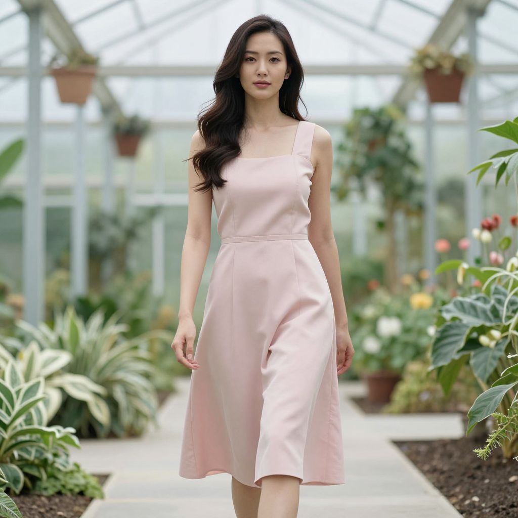Photograph of an Asian woman with long black hair, standing in a bright, greenhouse-like setting. She is wearing a sleeveless, pastel pink dress with a square neckline and a tied waist, reaching just above her knees. The greenhouse is filled with various potted plants, including ferns and flowering plants, arranged on either side of a tiled pathway. The background features a glass roof allowing natural light to illuminate the scene. She has a calm expression and is centered in the frame, walking towards the camera.