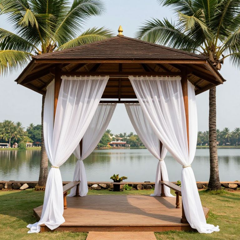 Romantic outdoor wedding setup featuring a wooden gazebo draped with sheer white curtains, overlooking a serene lake with palm trees, set against the backdrop of Heritage Village Resorts and Spa in Goa.