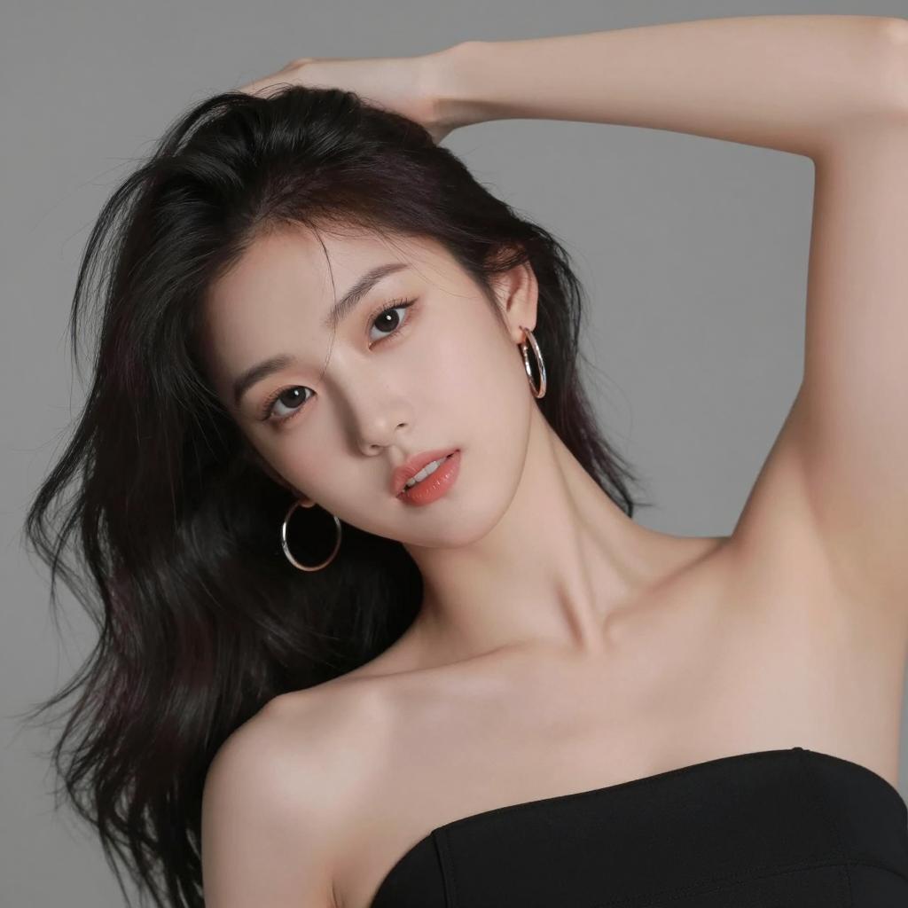 Close-up portrait of a young East Asian woman with long curly black hair and black eyes, wearing hoop earrings and a strapless black top. She is looking at the camera with softly parted lips, her hand resting on her head, showcasing a bare shoulder and visible collarbone. The background is blurred, emphasizing her smooth skin and delicate features in a photorealistic style.