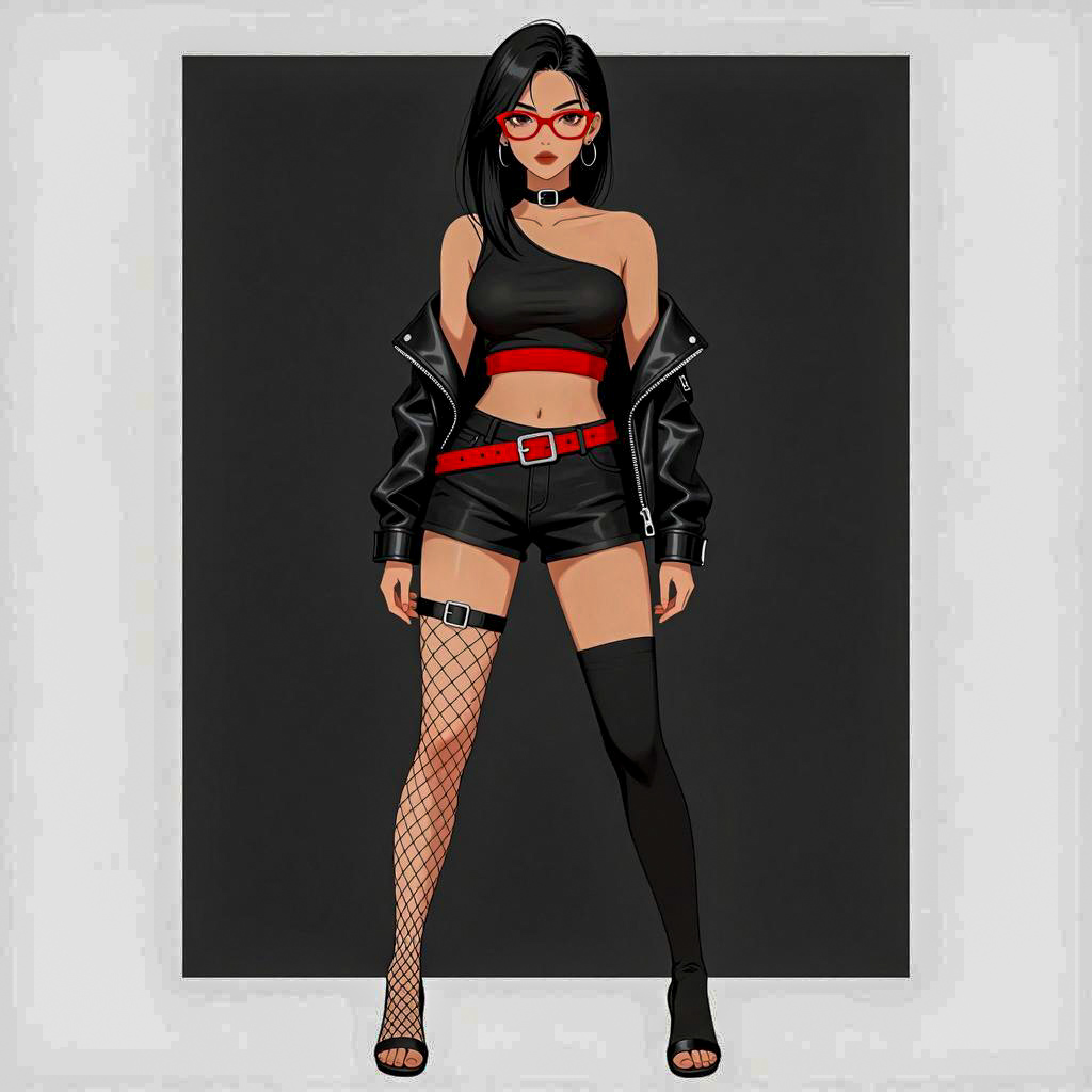 Digital illustration of a woman with black hair, red-framed glasses, and a choker. She wears a black one-shoulder top, red band, black shorts, fishnet thigh holster, and thigh-high black socks. Black leather jacket off her shoulders, red strap across waist, black sandals. Standing against a dark background. Left leg has a black thigh holster. Confident pose.