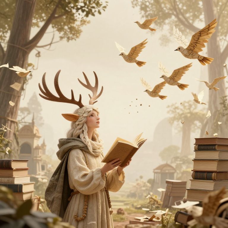 In a sanctuary of knowledge where stories take flight, a being adorned with antlers cradles the weight of wisdom, as living paper birds carry whispers of ancient tales through the air, weaving a tapestry of freedom and eternal curiosity.