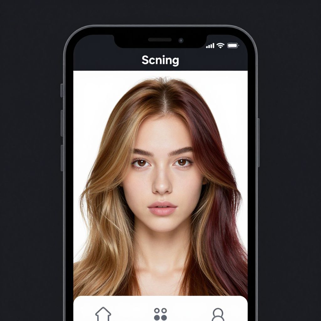 Try on hair colors online experience, close-up of a smartphone screen displaying virtual hair color change on a model’s head, showcasing seamless blending of colors like honey blonde and rich mahogany, minimalistic tech style with neon accents and dark mode UI.