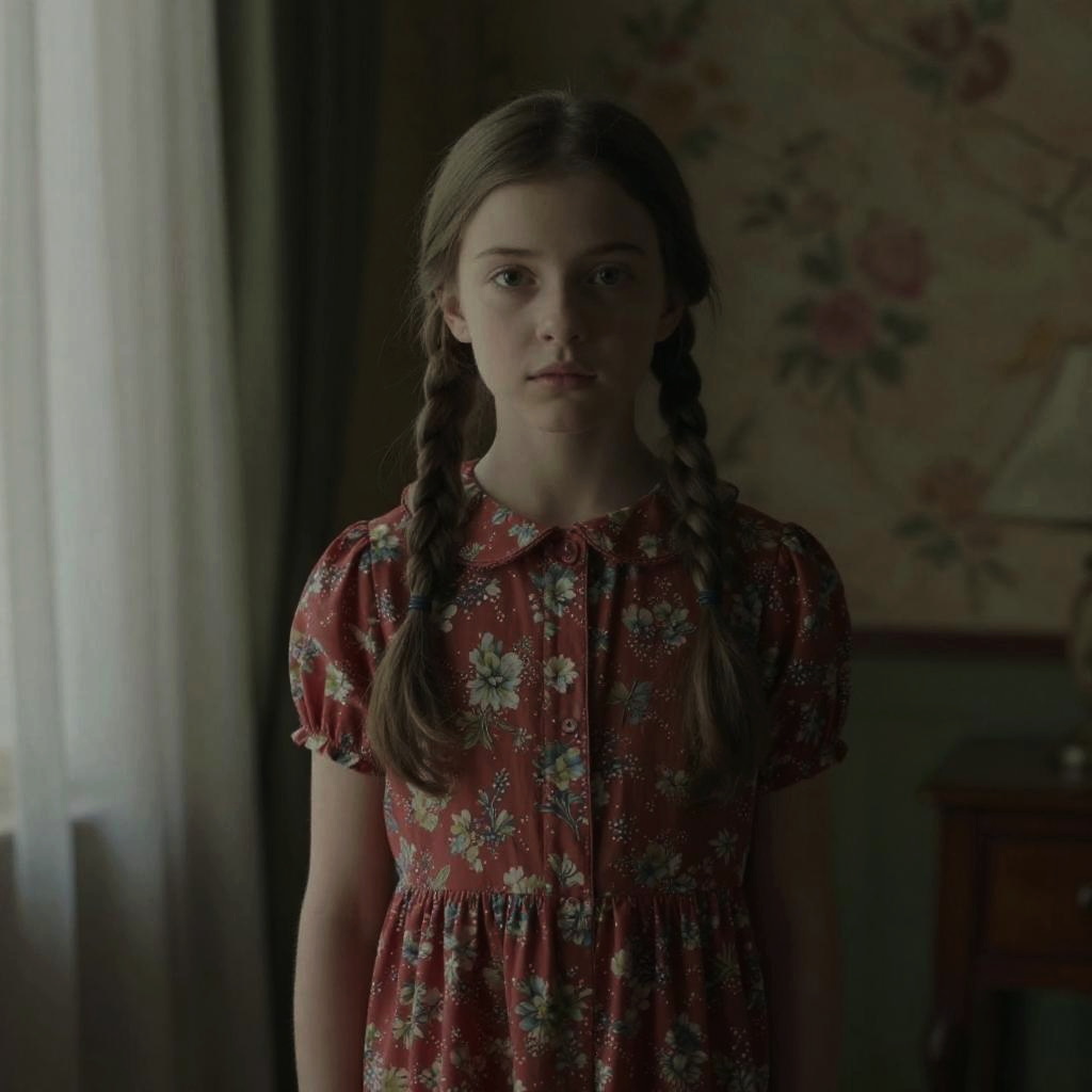 Portrait of a young girl with braided hair standing indoors in a dimly lit vintage room with floral wallpaper and soft curtains, wearing a faded red floral dress with a Peter Pan collar, moody cinematic atmosphere, soft lighting highlighting her face, muted color palette with green and brown tones