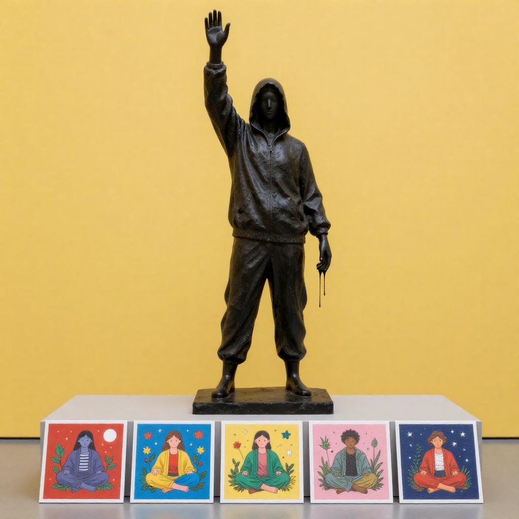 Black statue of a person with hooded face, baggy clothes, and one arm raised with dripping paint, standing on a base with five colorful, detailed images below. Bright yellow background.