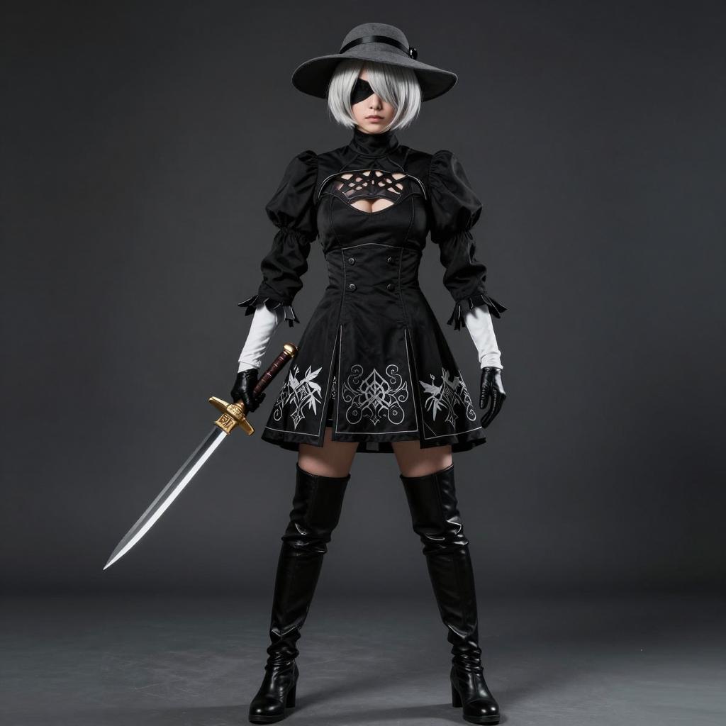 Full body portrait of a male wearing a Nier Automata inspired costume featuring a long black coat with white trim, black pants, black boots, leather gloves, and a wide-brimmed gray hat with black band. The subject has silver hair and stands confidently against a dark backdrop.