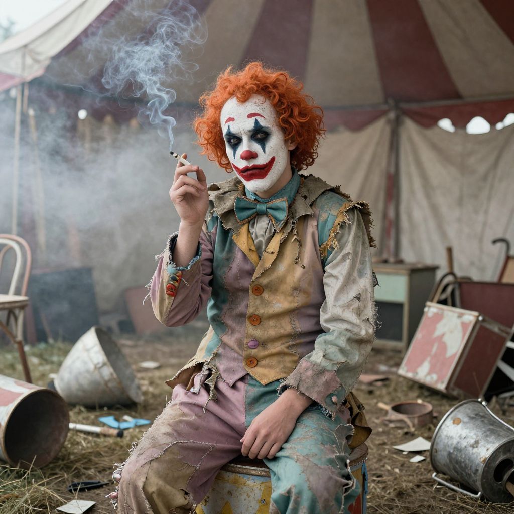 Sad clown smoking a cigarette in an abandoned carnival tent, tattered costume with faded colors, old circus props scattered, mist curling through the air, atmospheric surrealism, muted pastel tones with gritty texture.
