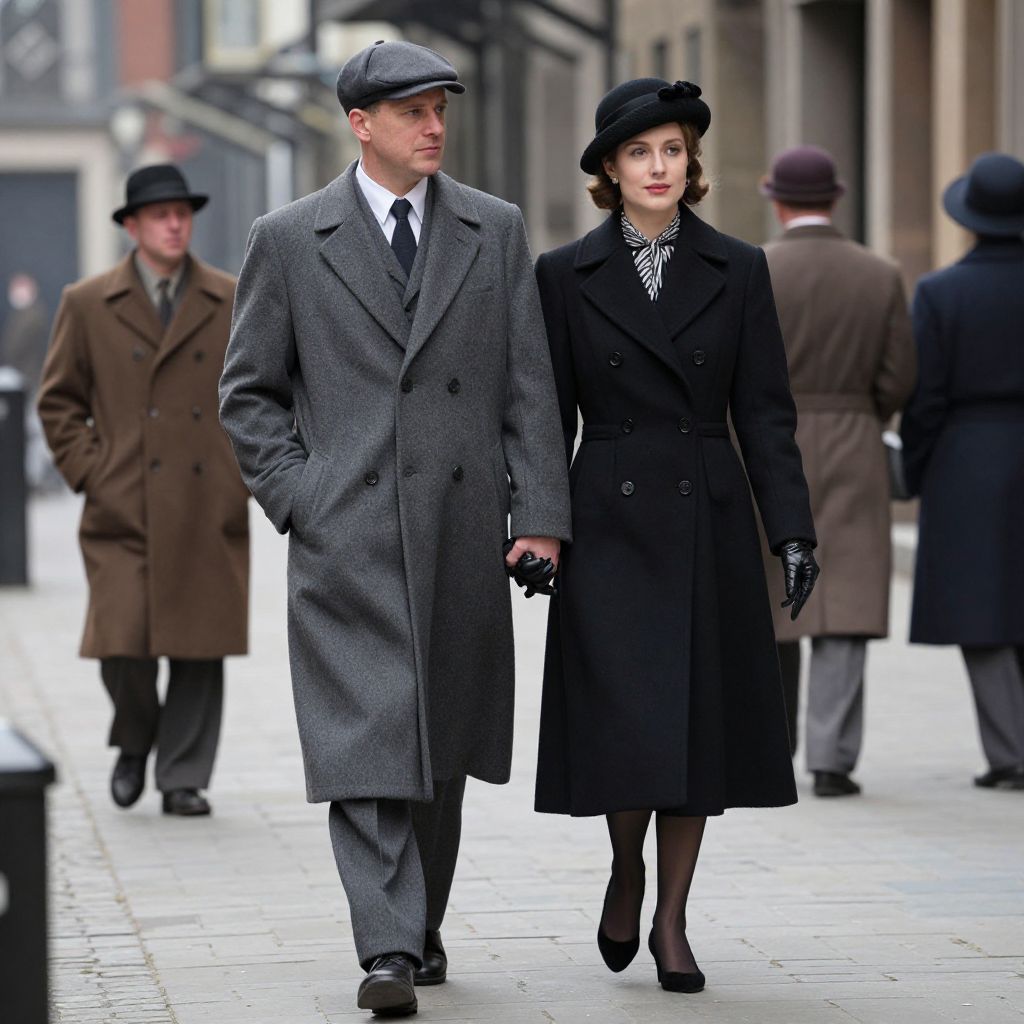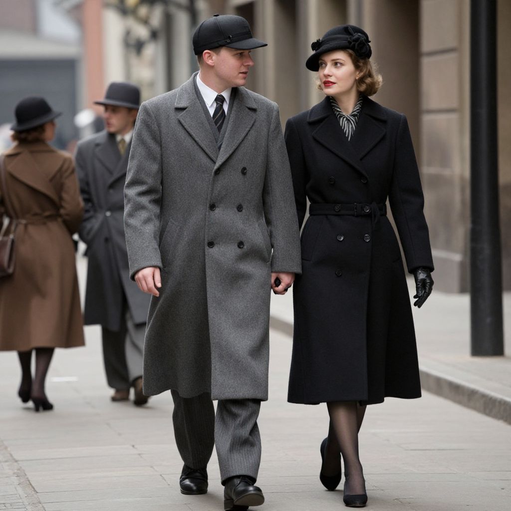 Stylishly dressed couple walking hand-in-hand along a vintage urban street in the 1930s, showcasing classic outerwear with the man in a gray overcoat and cap, and the woman in a black coat, hat, and gloves, while two other figures stroll in the background.