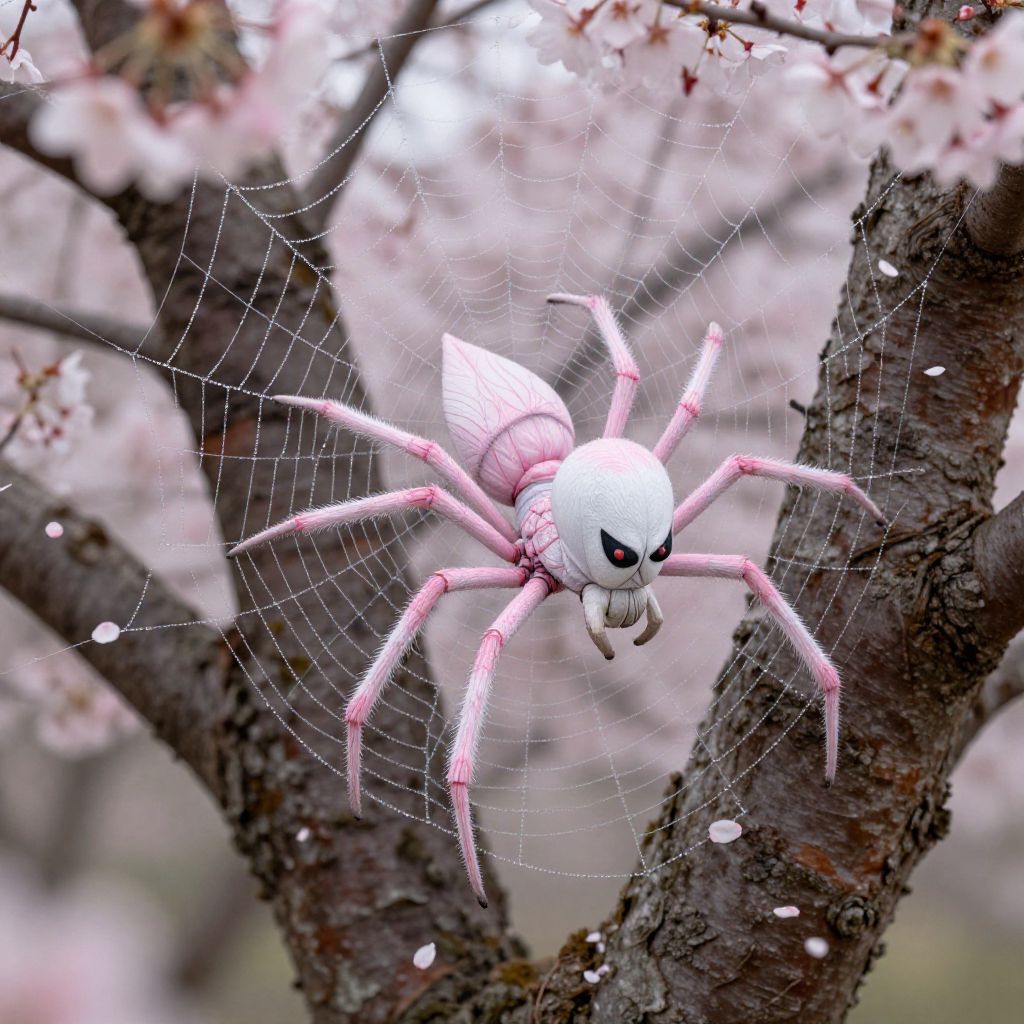 Photograph of a pink and white spider with a skull-like face, positioned in the center of a web between two dark brown tree trunks. The spider's legs are long and segmented, with pink tips, and its body has a smooth, glossy texture. The background is softly blurred, featuring pink cherry blossom petals falling, creating a contrasting soft and vibrant backdrop. The spider's web is intricately detailed with fine, white threads. The overall image has a surreal, slightly eerie aesthetic, with sharp focus on the spider and a dreamy, bokeh effect in the background.