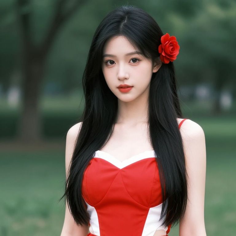 Asian girl with long black hair wearing a red dress with white accents and a red flower on her head.