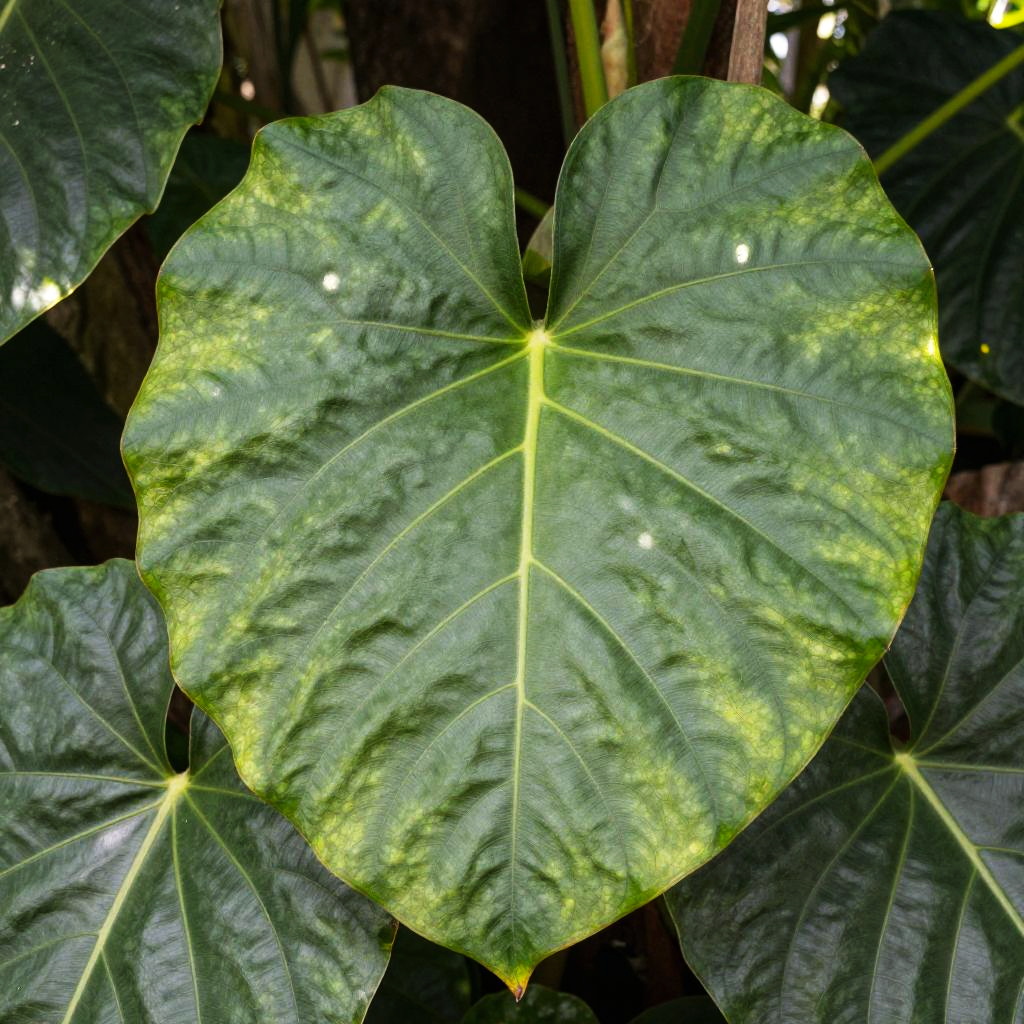Monstaria plant with large lush green leaves, detailed veins and natural sunlight filtering through a tropical jungle setting, photorealistic style with vibrant colors and soft shadows, close-up view showcasing texture and depth