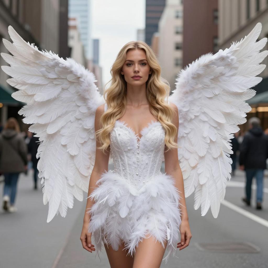 Photorealistic image of a woman standing in the middle of a city street wearing elaborate white feathered angel wings and a detailed white dress with feather accents. The woman has long blonde wavy hair, fair skin, and a neutral expression. The background features tall buildings and pedestrians, with soft daylight illuminating the scene, creating an elegant and fantasy-inspired atmosphere in an urban environment.