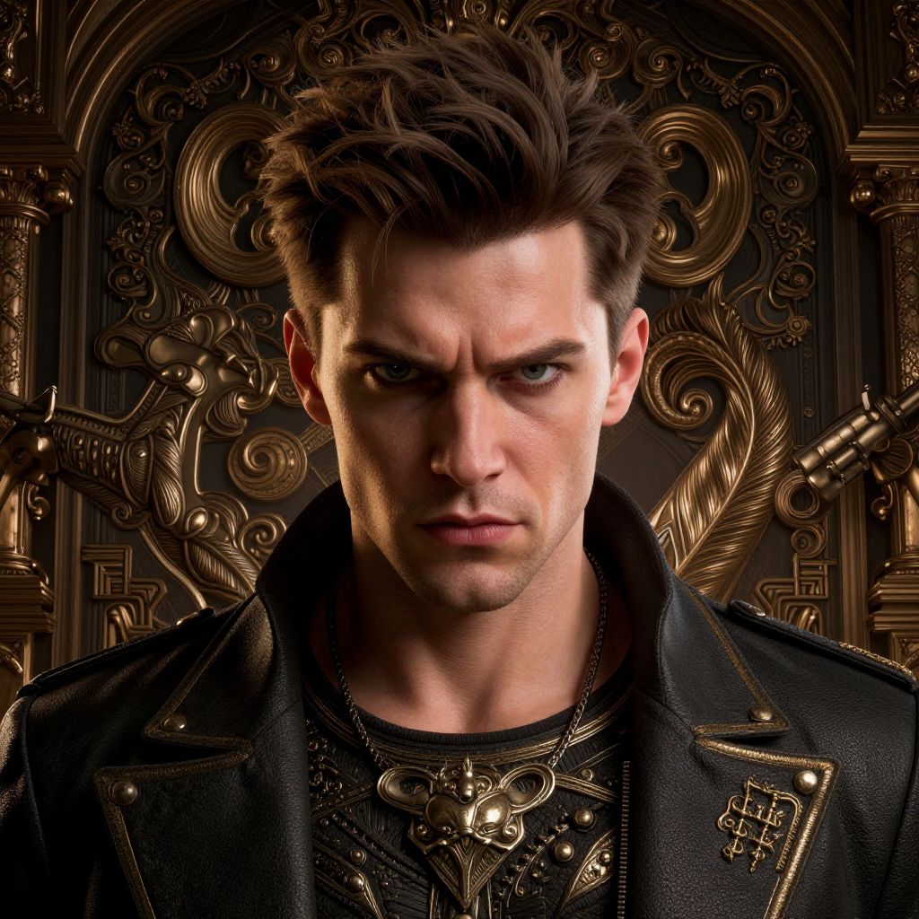 Photograph of a muscular, Caucasian man with short, spiky brown hair and intense blue eyes, staring directly at the camera. He has a stern expression and is wearing a black leather jacket adorned with gold embellishments and a detailed, ornate necklace. The background features intricate, dark, ornate patterns with swirling designs, giving a steampunk or medieval fantasy vibe. The lighting highlights his facial features and jacket, creating dramatic shadows. The image has a high-contrast, moody atmosphere.