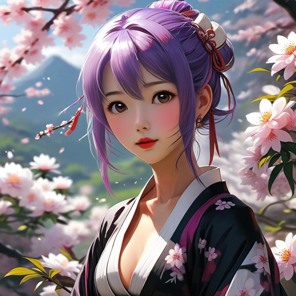 Digital anime-style drawing of a young Japanese woman with black hair in a floral kimono, seated on tatami mat in sunlit room.