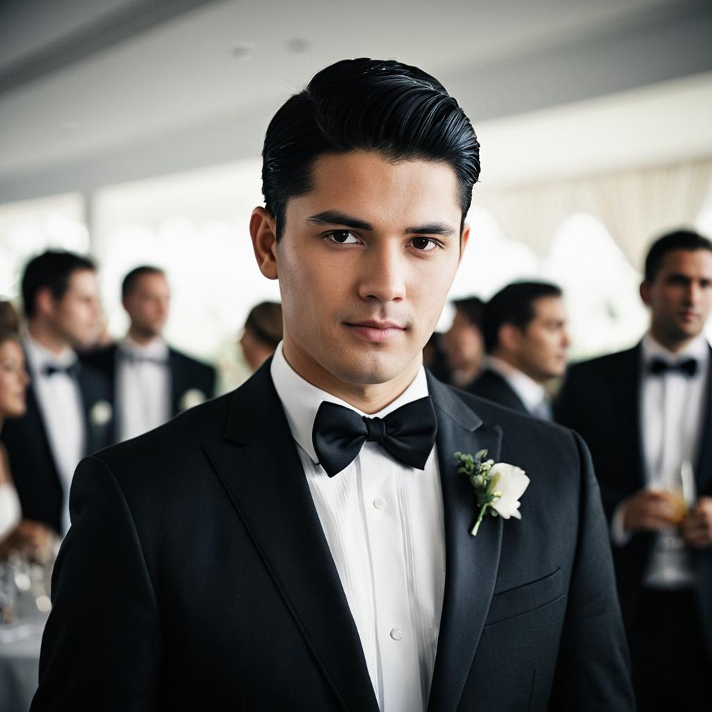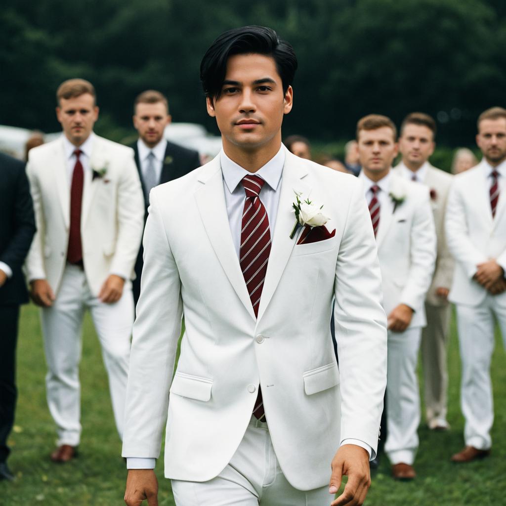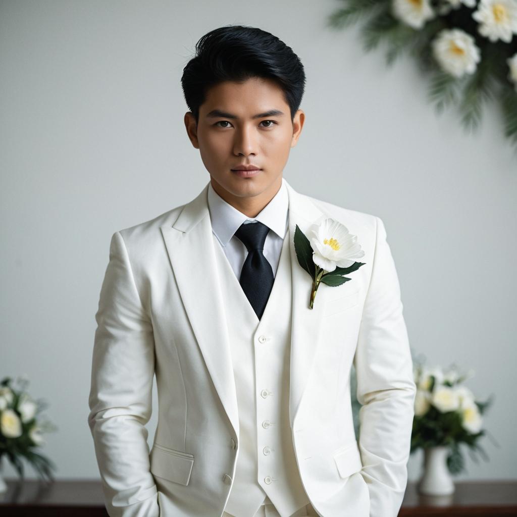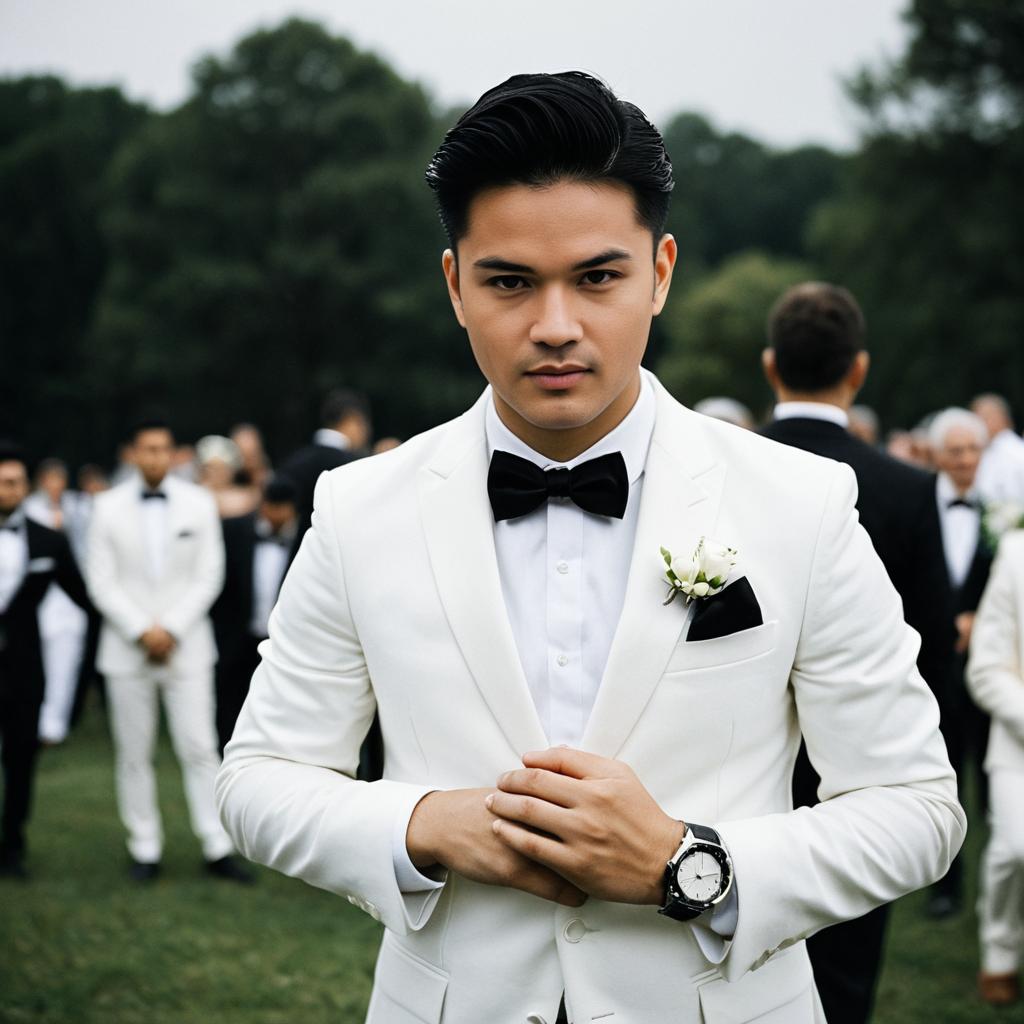 Man fashion dress wedding,1boy, male focus, watch, solo, bow, bowtie, realistic, wristwatch, blurry background, outdoors, formal, blurry, looking at viewer, jacket, suit, black hair, white pants, white shirt