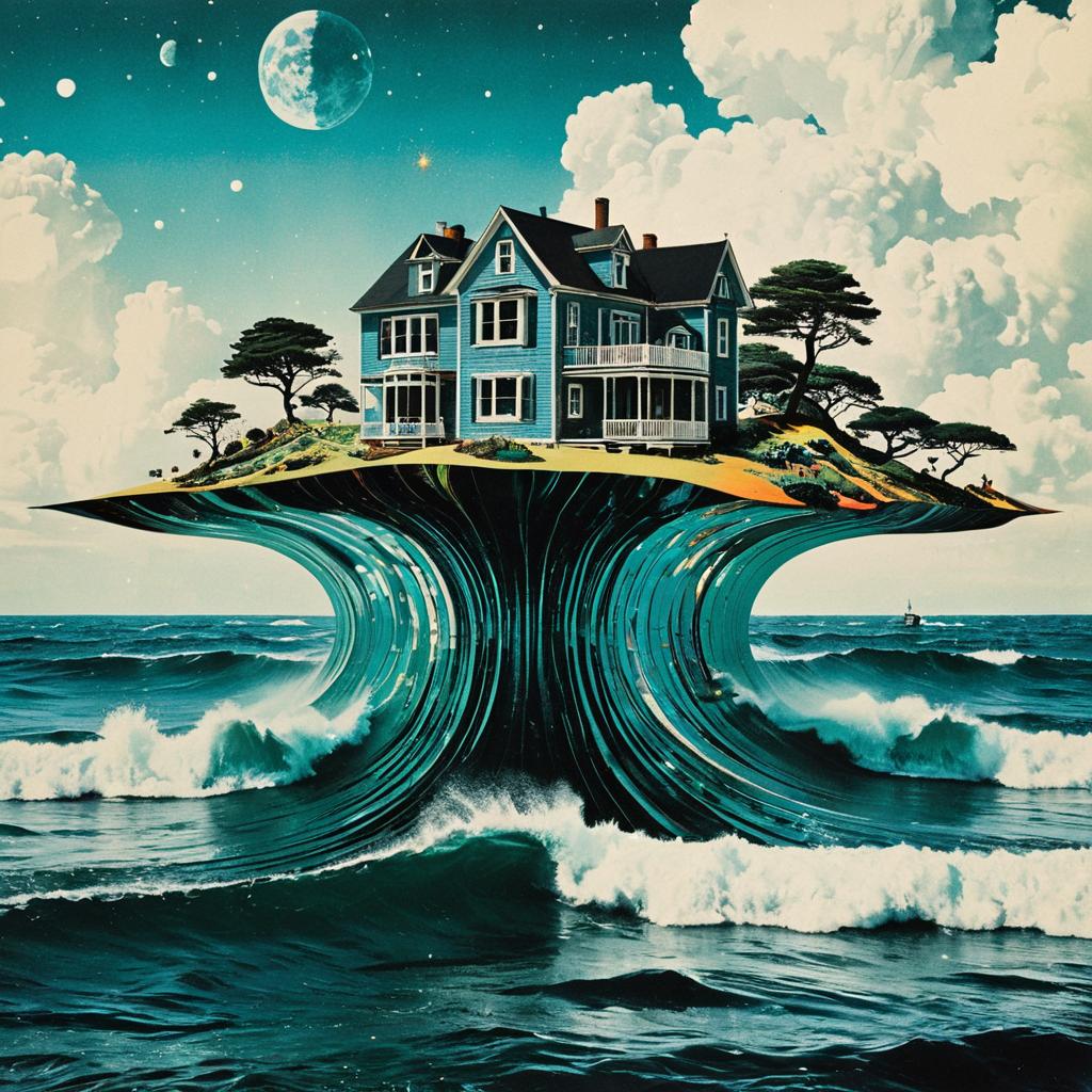 A vibrant surreal psychedelic collage featuring a floating island with a blue and orange house, surrounded by stylized trees and crashing ocean waves. The background depicts a large moon, multiple colorful planets, and retro 70s sci-fi inspired swirling patterns in bold blues, oranges, and yellows. The image combines vintage surreal art house aesthetics with liquid metal textures and cosmic elements.