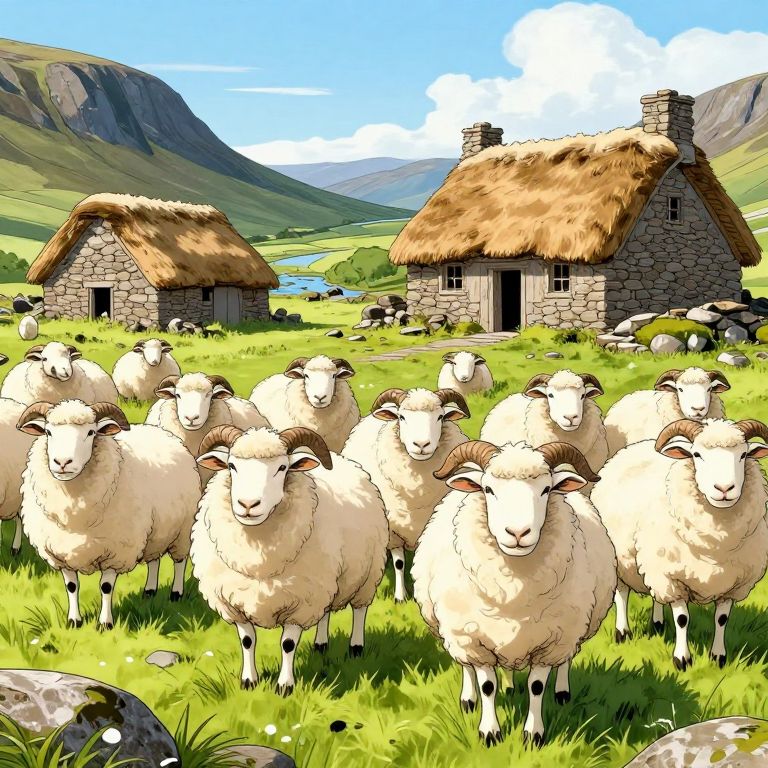 A herd of Cheviot sheep in a manga-style illustration, with ruins of thatched houses in the Scottish Highlands in the background.