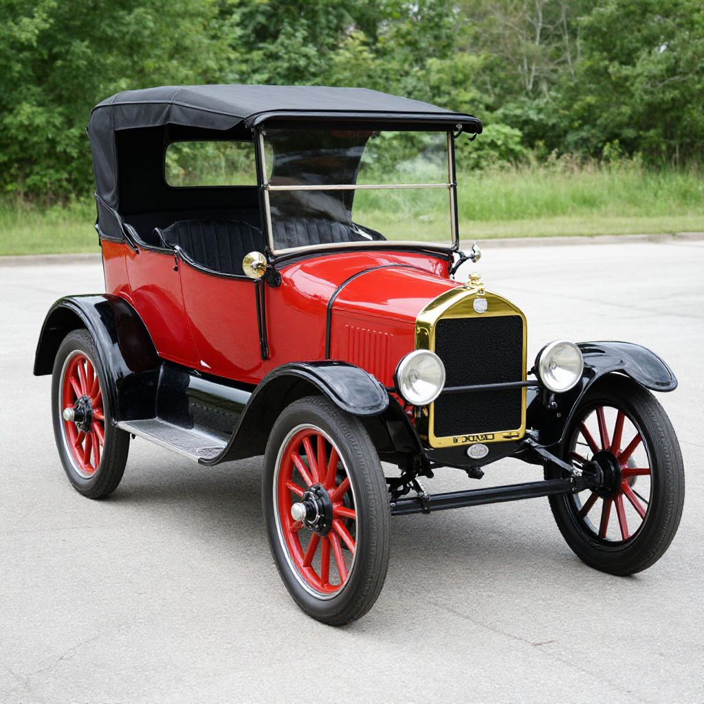 Photograph of a vintage red automobile with a black canvas top, black fenders, and red-spoked wheels, parked on a paved road. The car features a classic black grille with a gold emblem, round white headlights, and visible chrome accents. The background includes lush green trees and grass, suggesting a rural or park setting. The car's body is shiny and well-maintained, reflecting sunlight. The overall style is reminiscent of early 20th-century automobiles, with a focus on its elegant, retro design.