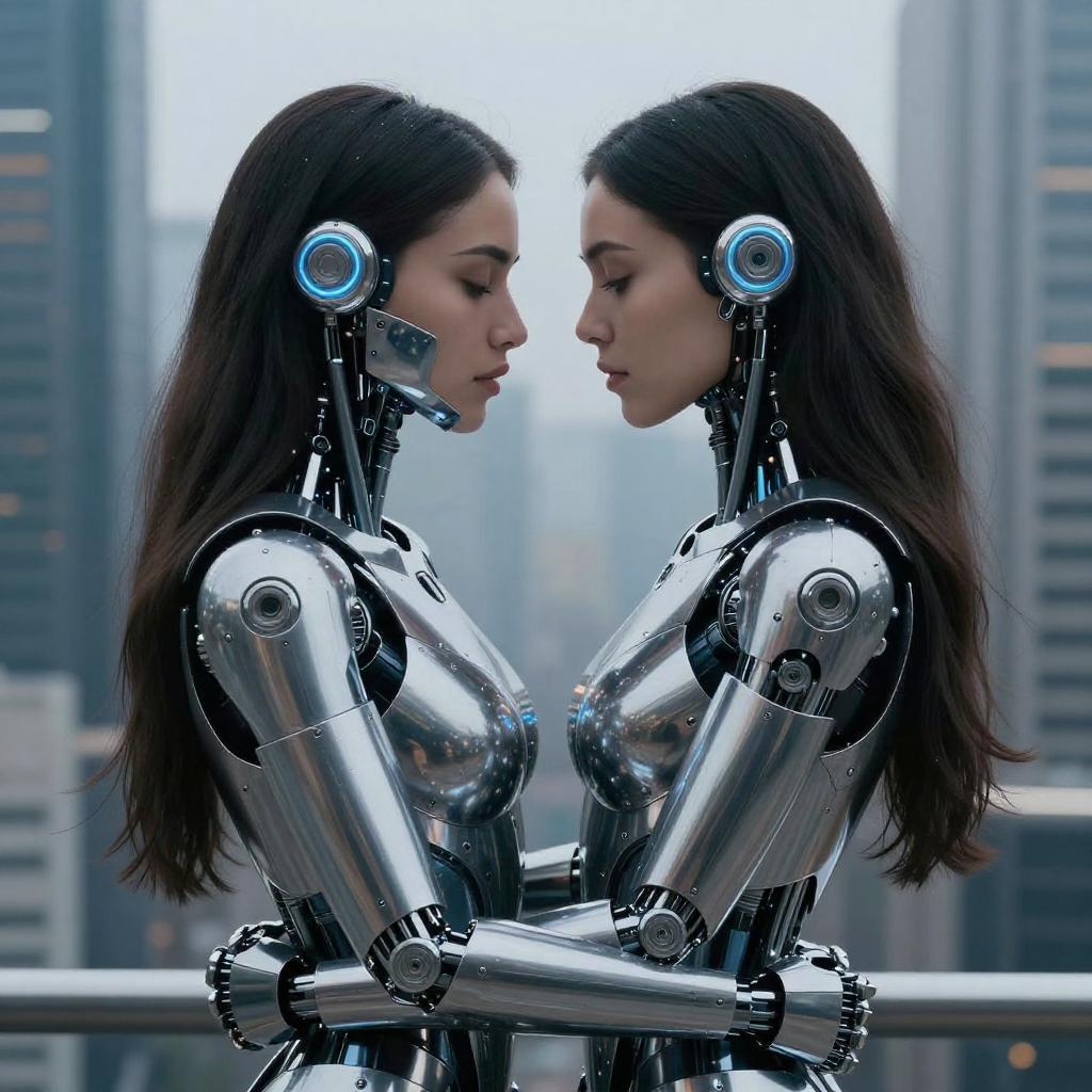 Photograph, science fiction, robot, woman, futuristic city, metallic armor, close-up, couple, cityscape, skyscrapers, blue tones, reflection, long hair, robotic arms, romantic, embrace, detailed, high contrast, urban background, digital art, glowing elements, sleek design, cybernetic, intimate, symmetrical composition, futuristic technology