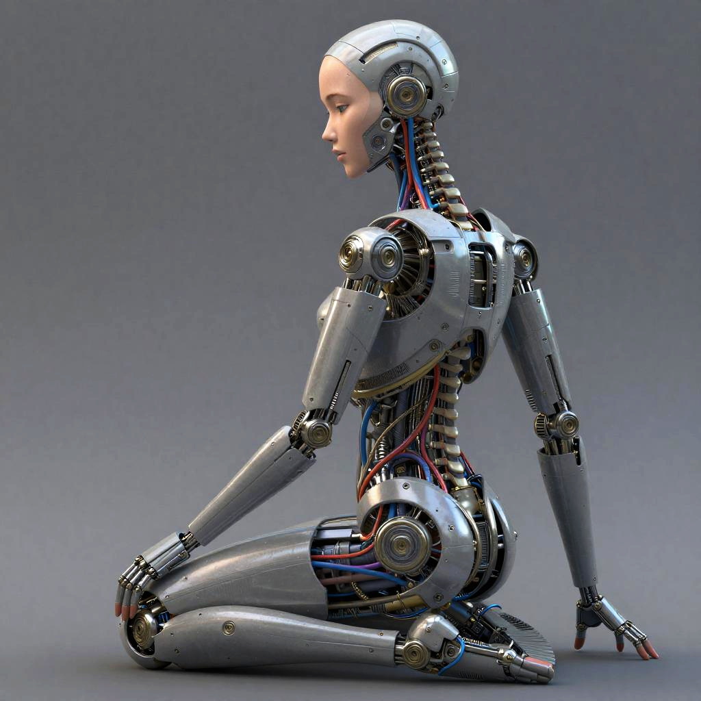 Photorealistic CGI image of a female humanoid robot with a sleek, metallic silver body, sitting in a kneeling position on a gray gradient background. Her head is bald with visible circuitry, and she has a serene expression. Her arms and legs are articulated with joints and wires, including blue and red cables along her spine. The robot's torso and limbs are shiny and reflective, showing detailed mechanical components. The image focuses on the side profile, highlighting her elegant, yet mechanical form. The style is modern and futuristic, emphasizing advanced robotics and artificial intelligence.