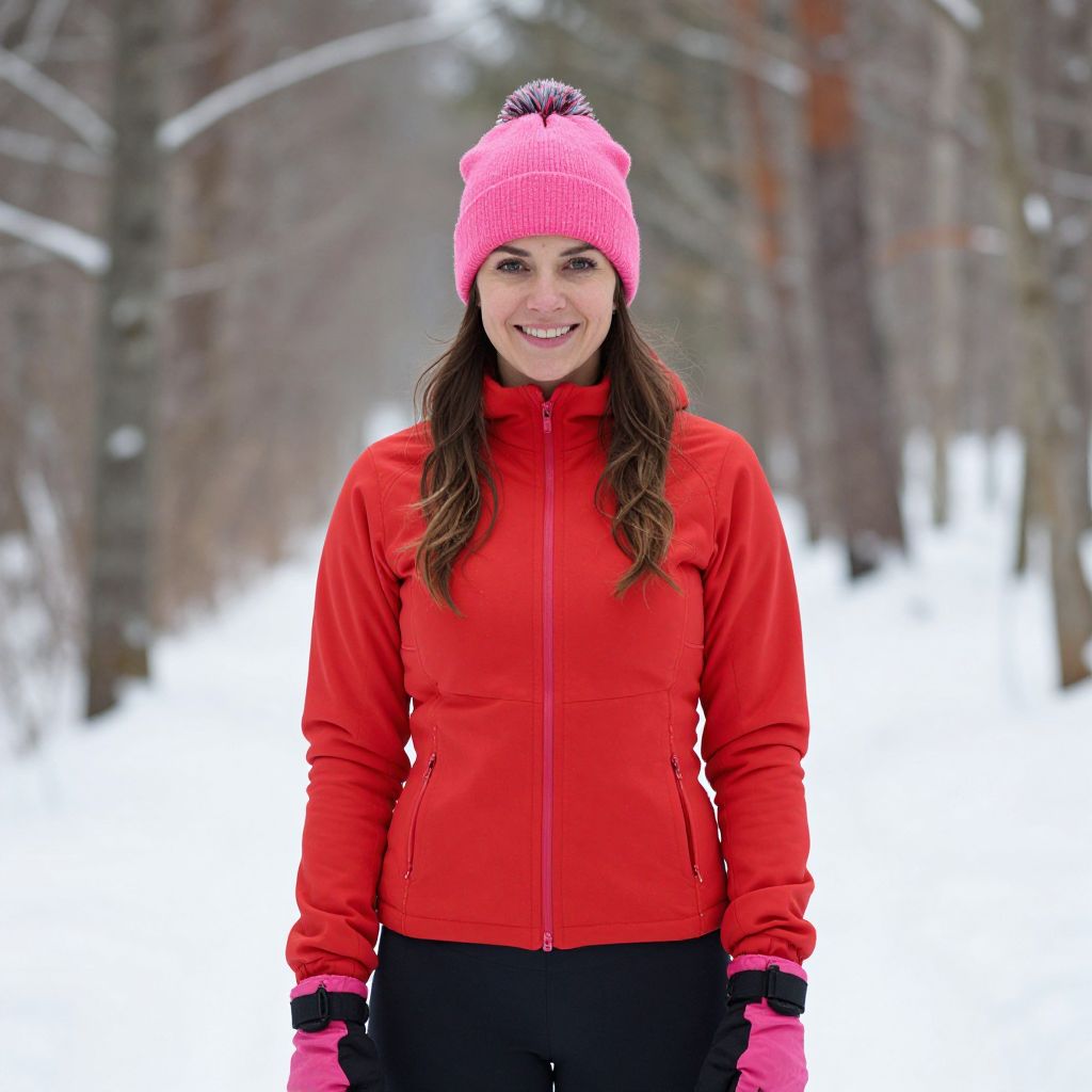 Woman smiling warmly in a snowy forest, dressed in a vibrant red Adidas jacket, pink knit hat, and matching gloves, exuding confidence and readiness for winter workouts.