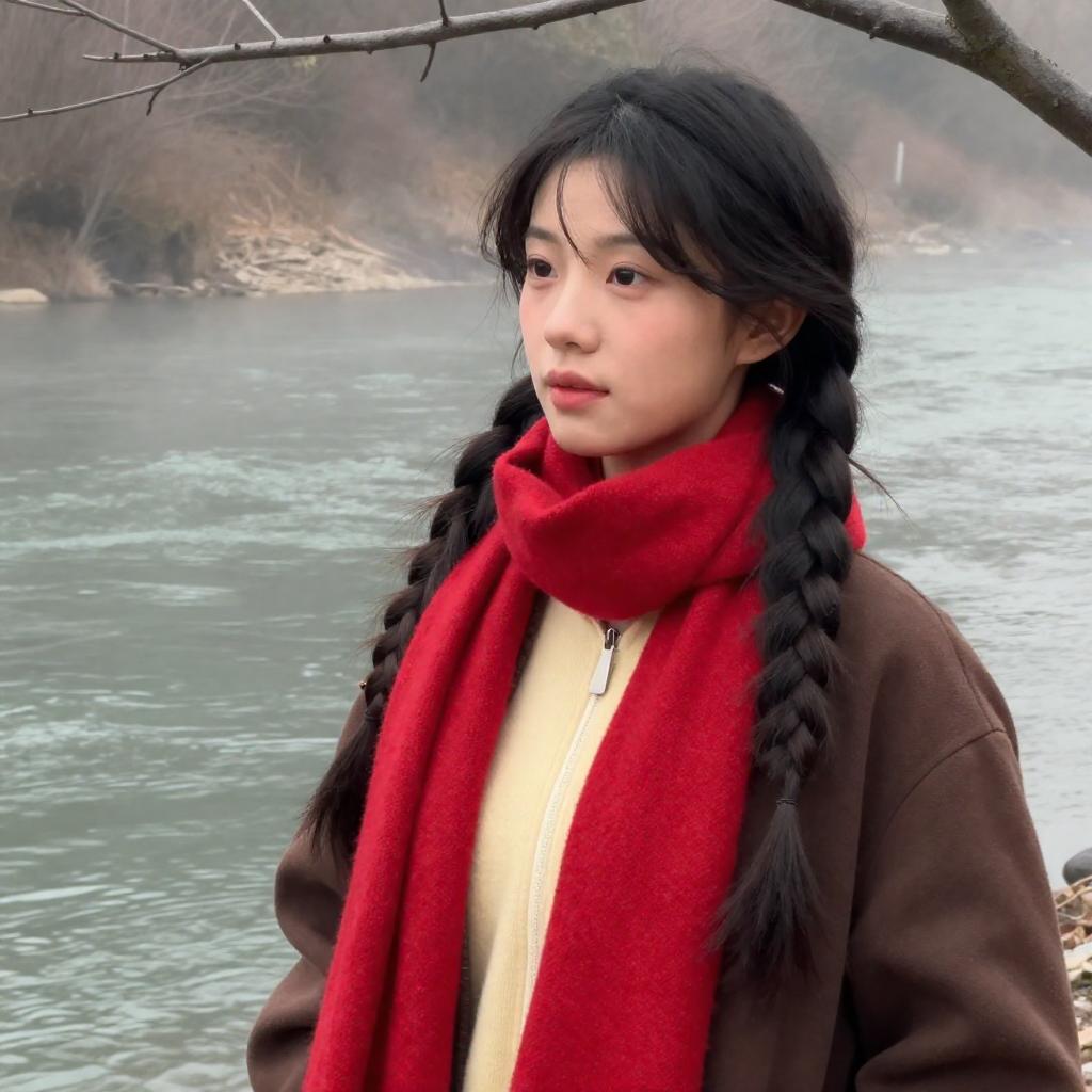 A young woman with vibrant red hair stands in a snowy mountain landscape at sunset, wearing a denim jacket and a thick purple scarf. The serene atmosphere is enhanced by soft falling snowflakes and a backdrop of snow-covered peaks, creating a peaceful winter scene with natural light and cool color tones.