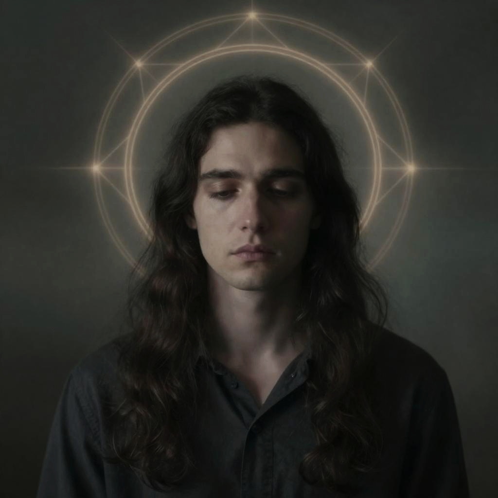 Photograph of a young man with long, dark, wavy hair and fair skin, gazing downward with a solemn expression. He wears a dark, button-up shirt. The background is a dark, gradient blue, with a glowing, golden, circular halo composed of connected star-like points behind his head, creating a mystical, ethereal effect. The lighting is soft, highlighting his face and the halo, while the rest of the image is in shadow, adding depth and contrast. The overall style is reminiscent of gothic or mystical portraiture.