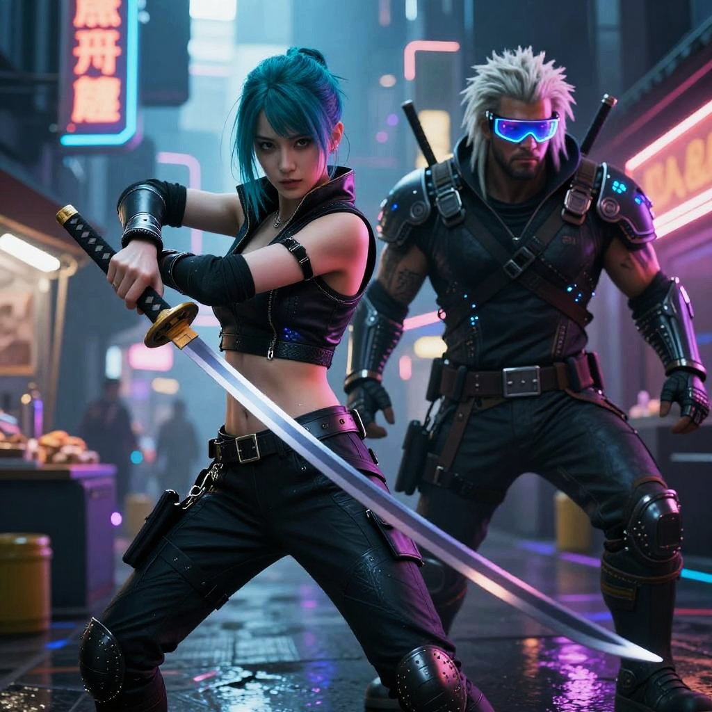 A cyberpunk scene featuring an agile female neon samurai with teal undercut wielding a katana alongside a burly male hacker with platinum dreadlocks, set in a cybernetic neon-lit street bazaar, wearing synthetic armor plating and holographic visors, hyper-realistic, ray tracing, dynamic lighting, high detail