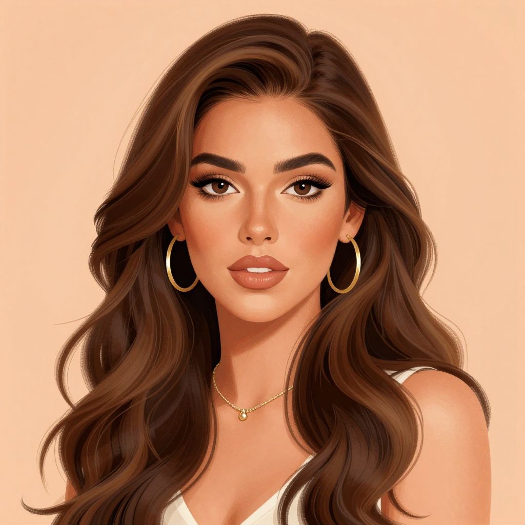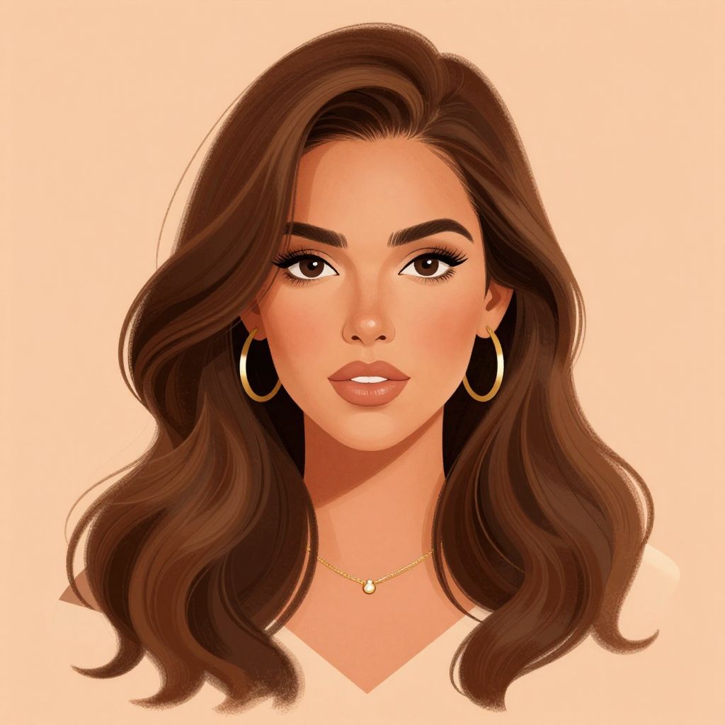 A digitally rendered portrait featuring a woman with long, wavy brown hair, adorned with gold hoop earrings and a delicate necklace, set against a warm peach background, showcasing a high-definition, illustrative style reminiscent of Jenny Kelley's aesthetic.