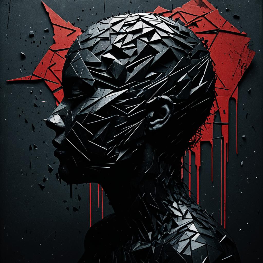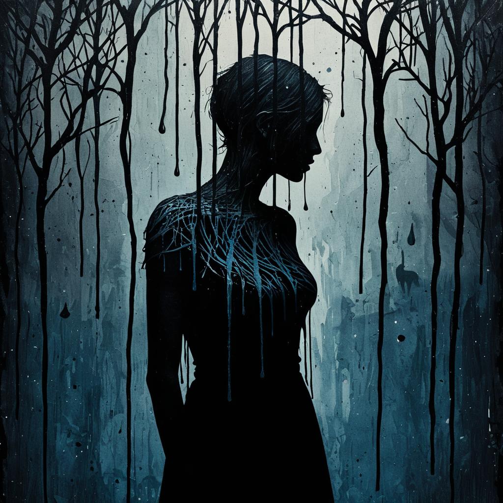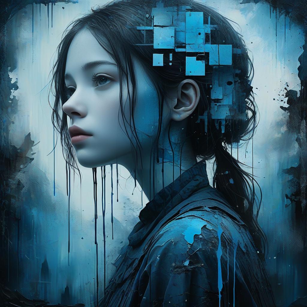 Surreal, abstract portrait of a young girl with a focus on loneliness. The artwork features intricate layers and textures, with elements like surreal symbols interwoven into the subject’s form. The composition is rendered in a dark, moody palette with touches of blue to add contrast and visual depth. Designed with a rough, textured aesthetic that includes dripping, smeared, or fragmented details, creating a haunting and enigmatic atmosphere. Inspired by surrealist and abstract techniques, this piece captures an emotional depth and a sense of mystery, evoking feelings of contemplation.