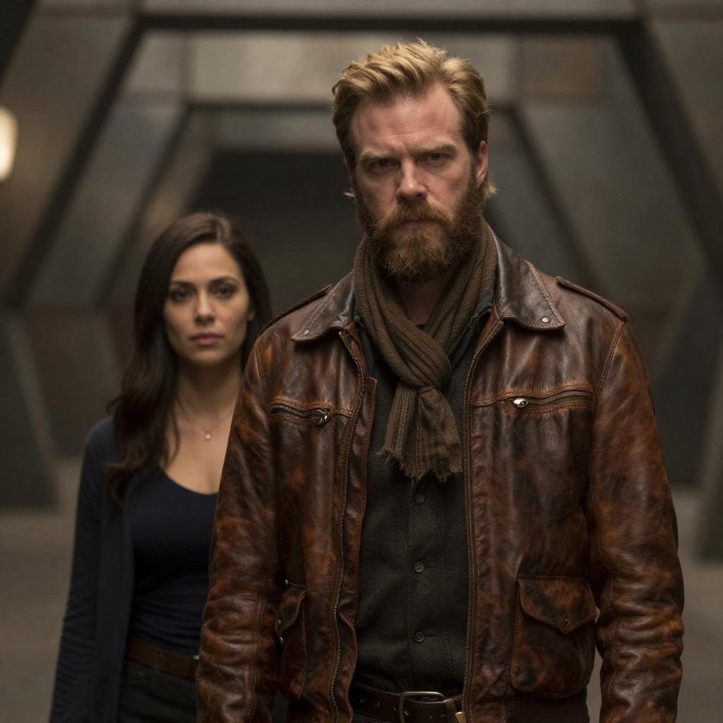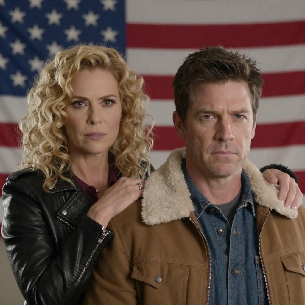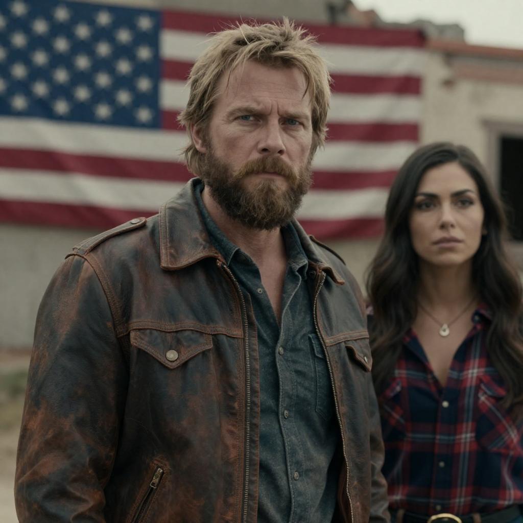 Photograph of a rugged, bearded man with blonde hair in a worn leather jacket standing beside a woman with dark hair wearing a plaid shirt. American flag in the background with ruined buildings. Man's intense gaze, woman's neutral expression.