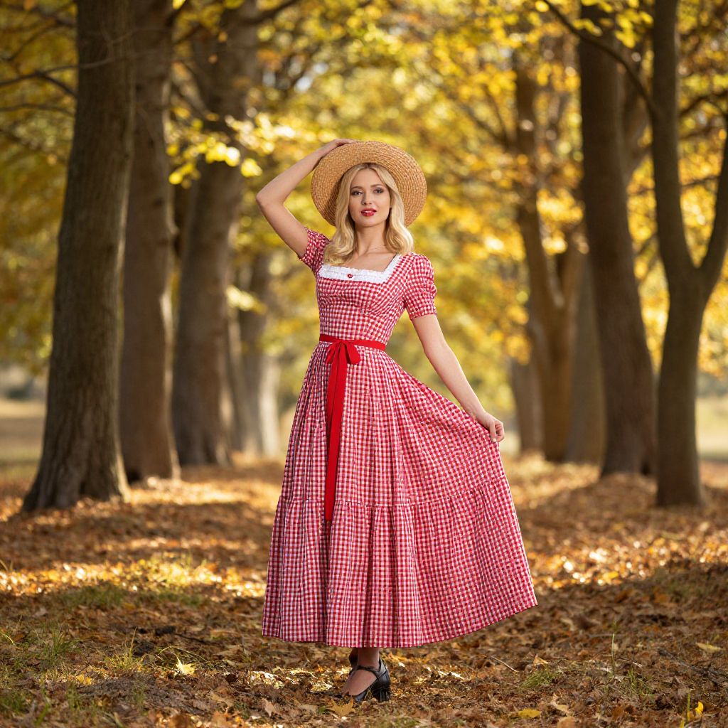 Photograph of a blonde woman standing in an autumn forest. She wears a red and white gingham dress with a white square neckline, short sleeves, and a red ribbon tied at the waist. She also sports a wide-brimmed straw hat and black Mary Jane shoes. Her right hand touches her hat, and her left hand holds the dress's skirt. The forest background features tall trees with yellow leaves and a carpet of fallen leaves on the ground. The lighting is warm, highlighting the golden hues of the foliage.