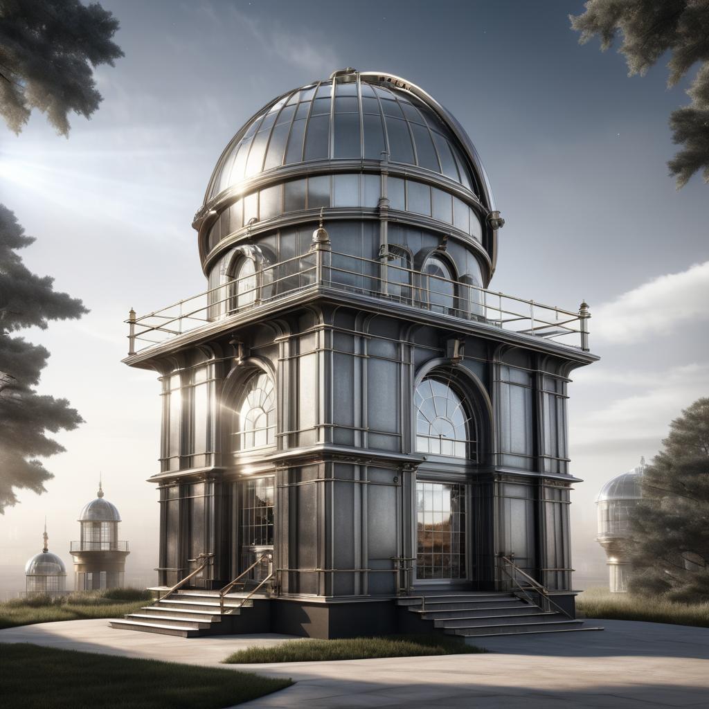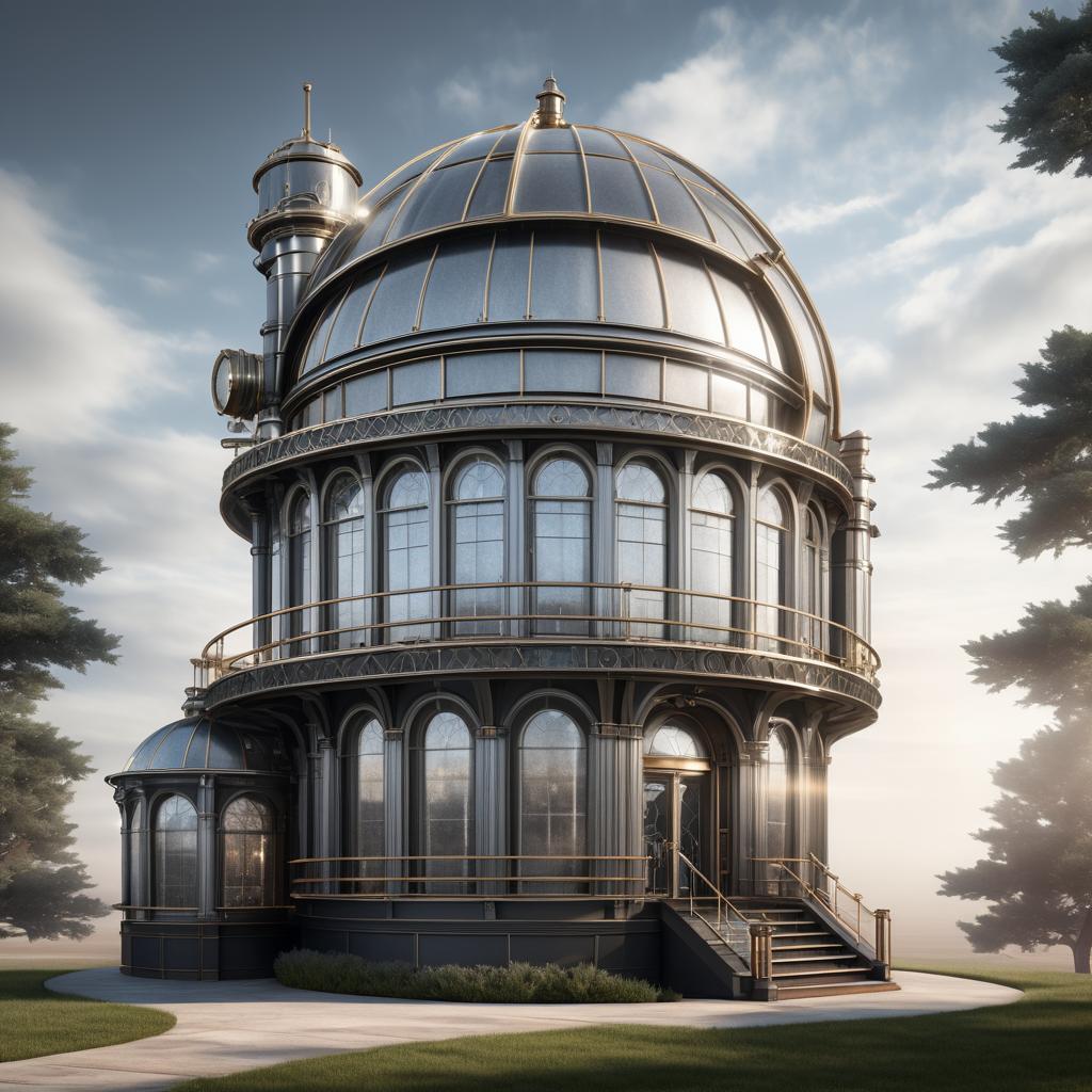 Architectural rendering of a vintage steam-punk observatory with a mysterious silver shimmer, photorealistic and cinematic.
