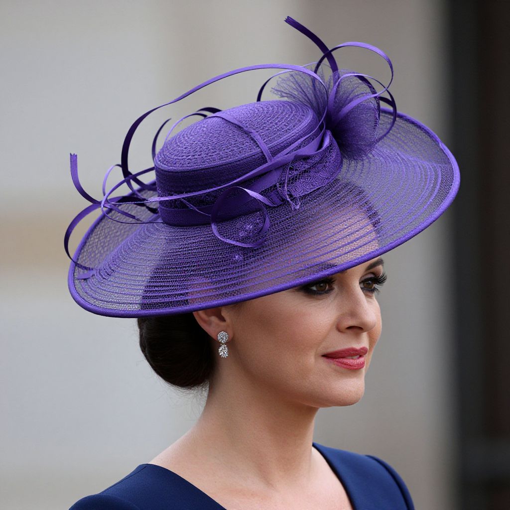 Stylish woman wearing a stunning first lady church hat in vibrant violet, featuring intricate mesh detailing and cascading ribbon embellishments, exuding elegance for special occasions.