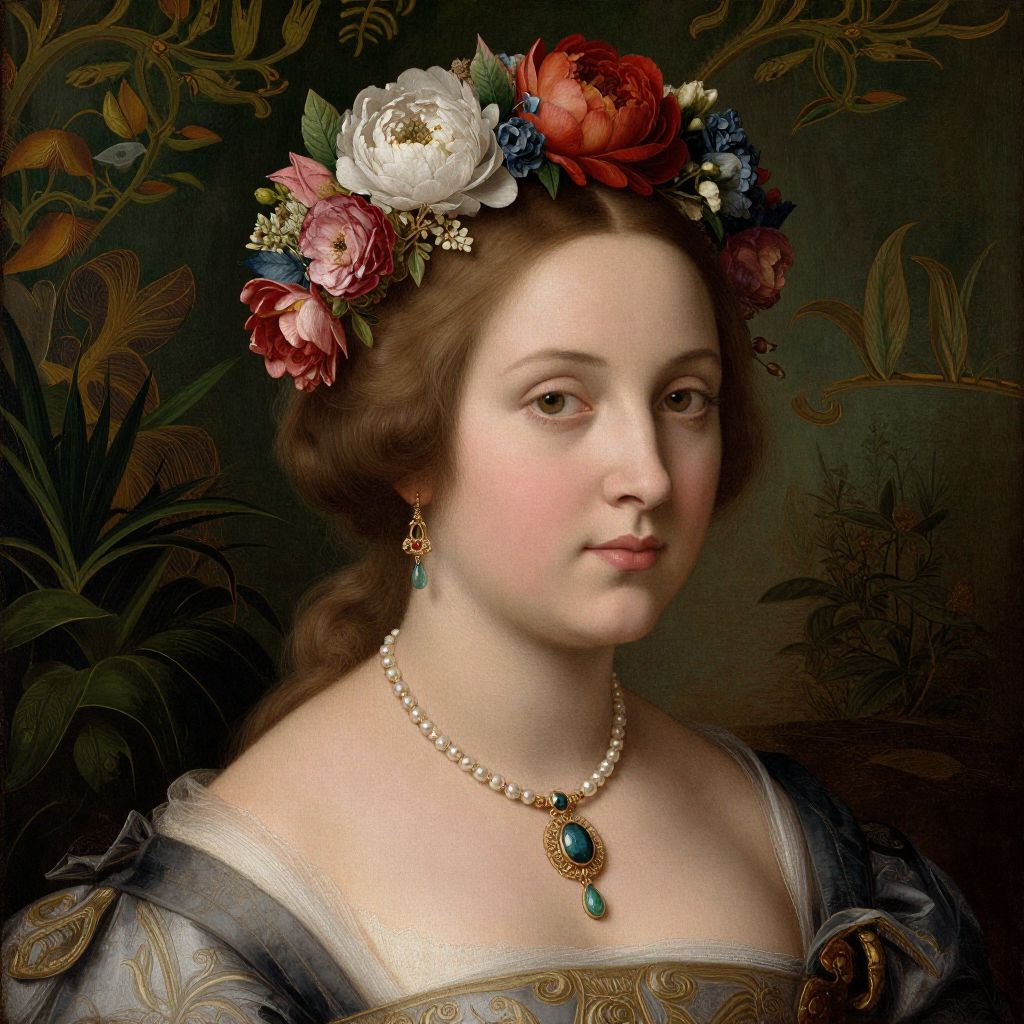 A digital artwork inspired by classical portraiture, featuring a woman adorned with floral headwear and elegant jewelry, set against a lush, botanical backdrop with intricate detailing reminiscent of Renaissance paintings.